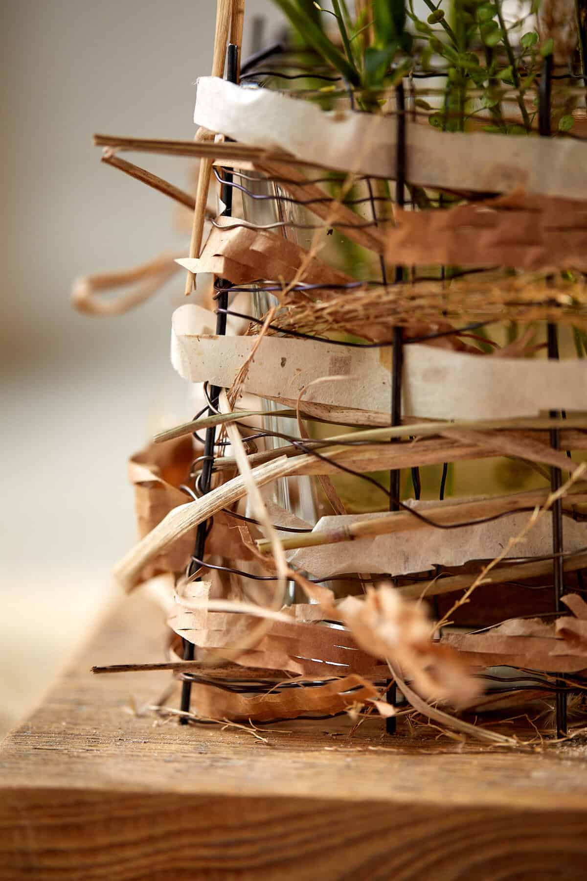 Zuerst Löcher in die Holzscheibe bohren. Anschließend die Steckdrähte dort einstecken. Dann die Steckdrähte mit Wickeldraht umwickeln, sodass hiernach diverse Papiersorten und Chinaschilf eingewebt werden können. So entsteht ein zylinderartiges Grundgerüst. Nun das Glas mit Wasser füllen und mittig in die Konstruktion einsetzen. Im nächsten Schritt die Floralien durch das Drahtgitter weben und ins Glas stellen. Zuletzt die Holzscheibe mit Muscheln und Sand dekorieren.