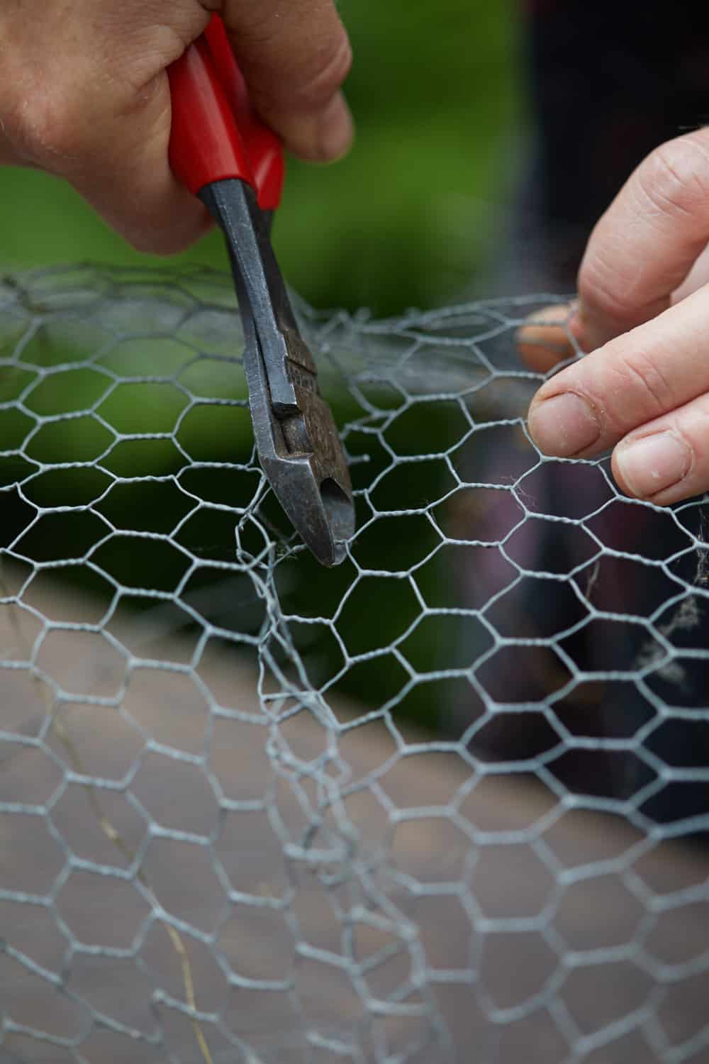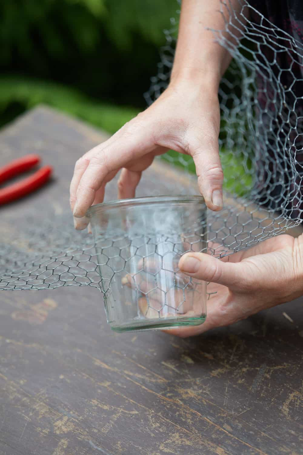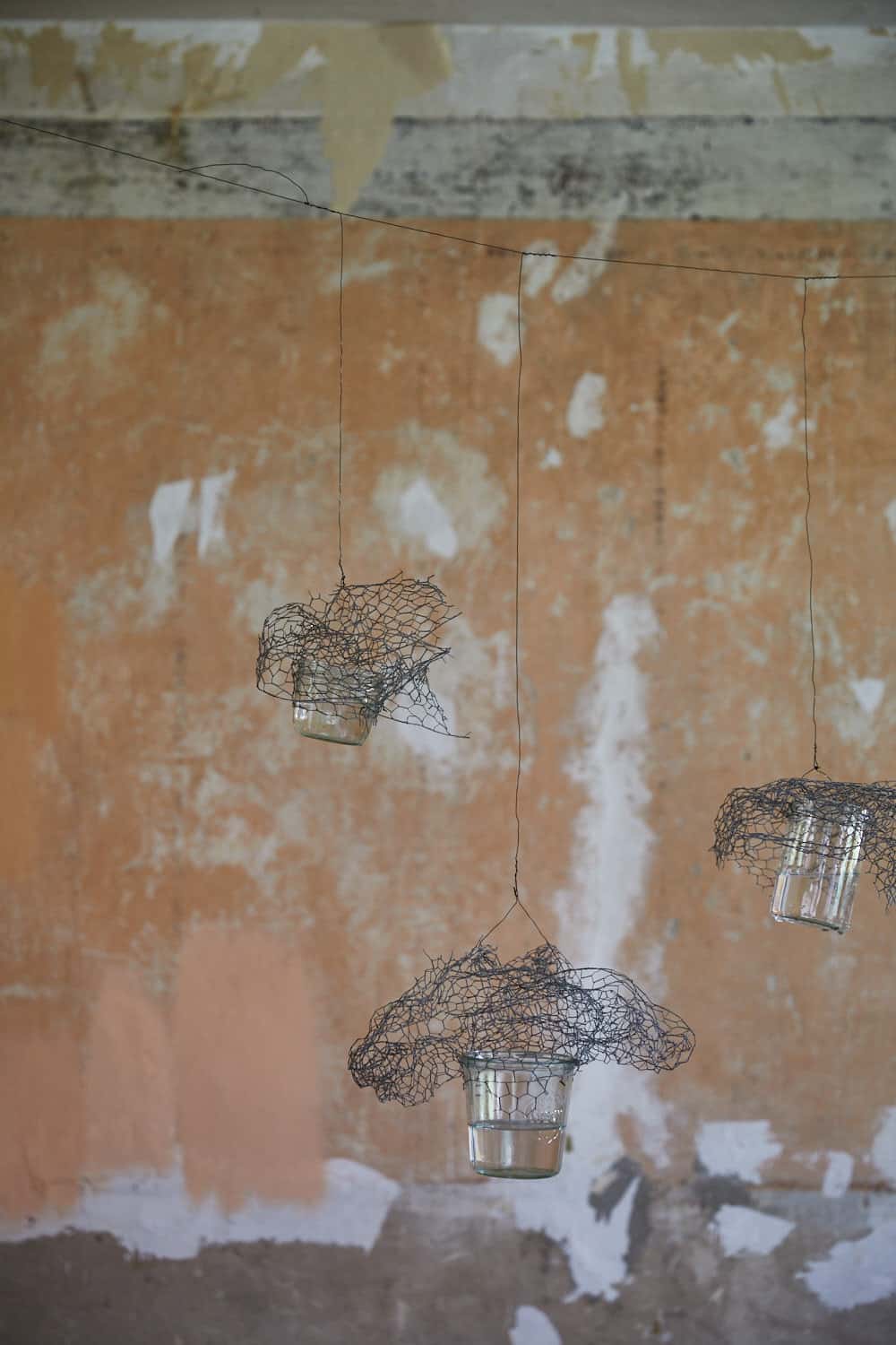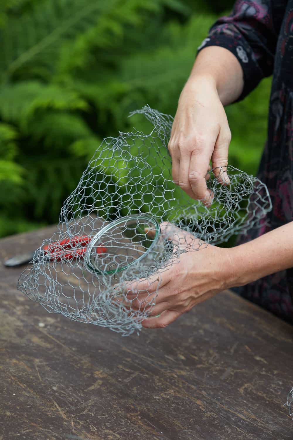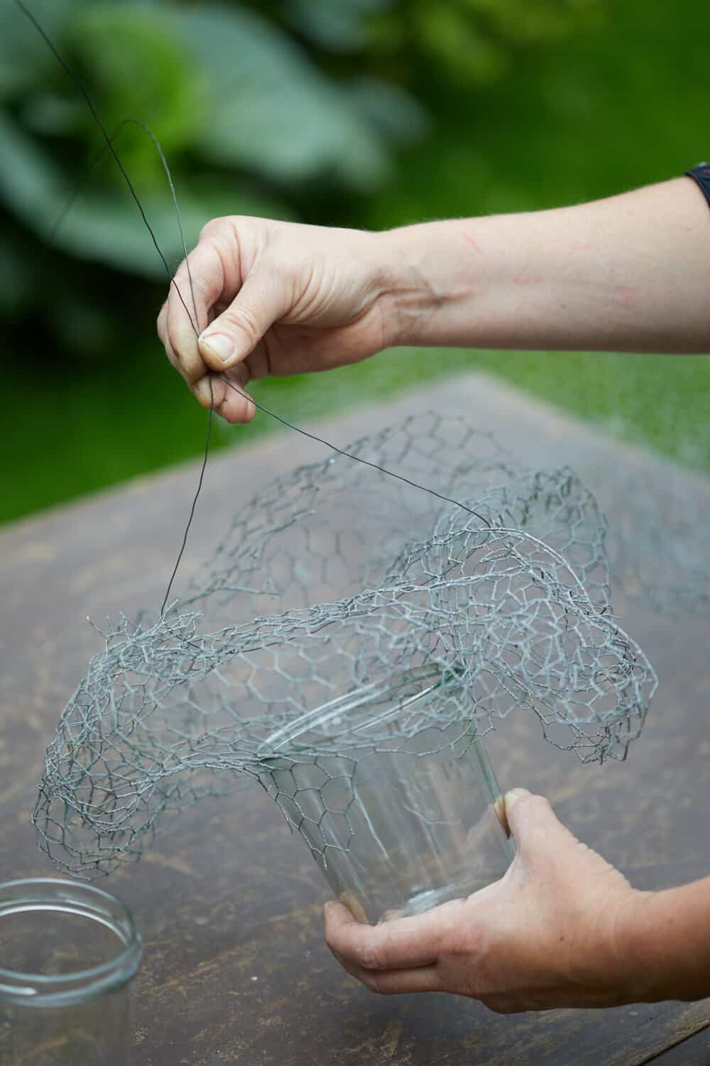 Den Hasendraht quadratisch zuschneiden. Ein Einmachglas darauf positionieren, um die Größe abzuschätzen. Dann ein Loch in den Draht schneiden, durch das das Einmachglas passt, ohne dass es einfach durchrutscht. Das Gefäß durch das Loch schieben, mit Wickeldraht fixieren. Die abstehenden Drahtflächen nach innen klappen, sodass ein voluminöser Kragen um das Glas herum entsteht. Ein langes Stück Wickeldraht durch den Kragen aus Drahtgeflecht schieben, zu einer Aufhängung formen und das Gefäß aufhängen. Erst dann geht es an die blumige Gestaltung: Dafür verschiedene Blüten durch den Hasendraht-Kragen ins wassergefüllte Glas schieben. Dieser Kragen dient als Steckhilfe, der dafür sorgt, dass die Blumen genügend Halt haben. Zum Schluss sicherstellen, dass die Blüten genügend Wasser haben.