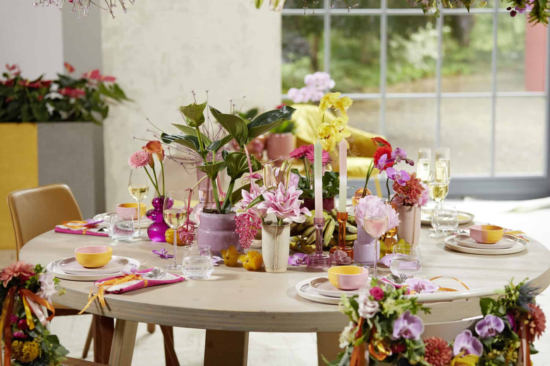 Neben edlen Schnittblumen, die in unterschiedlich hohen und stilistisch abgestimmten Vasen arrangiert werden, sorgen auch kleine florale Akzente als Serviettenschmuck für ein stimmiges Gesamtbild. Sie greifen Farben und Formen der Hauptdekoration auf und verbinden die einzelnen Elemente zu einem harmonischen Ensemble. In der Tischmitte ziehen zudem ausgewählte Topfpflanzen die Blicke auf sich. Mit ihrem satten Grün und ihrer natürlichen Ausstrahlung schaffen sie Frische und Lebendigkeit. Der besondere Clou sind exotische (künstliche) Früchte, die locker zwischen Blüten und Pflanzen platziert werden. Sie setzen überraschende Akzente, bringen zusätzliche Farbnuancen ins Spiel und verleihen dem Arrangement eine moderne, leicht verspielte Note. So entsteht ein abwechslungsreicher Tischschmuck mit spannenden Kontrasten, der Natürlichkeit und Extravaganz geschmackvoll miteinander verbindet.