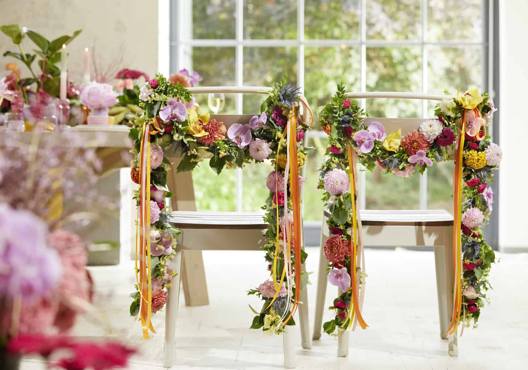 Bitte Platz nehmen! Die Stühle des Brautpaares werden mit üppigen, fließend fallenden Blumengirlanden geschmückt, die durch zarte Bänder zusätzlich veredelt werden. So entsteht ein festlicher Rahmen für den Ehrenplatz oder ein stilvoller Blickfang während der Zeremonie. Für die Girlanden werden die einzelnen Werkstoffe dicht an dicht mit Draht um ein langes, stabiles Seil gewickelt. Auf diese Weise entsteht eine kompakte, gleichmäßige Struktur, die zugleich flexibel bleibt und sich harmonisch an die Form der Stuhllehne anpasst. Die edlen Phalaenopsis-Blüten erhalten zusätzlich eine Sicherung mit Steckdraht, damit sie optimal positioniert sind und auch über einen längeren Zeitraum hinweg ihre elegante Wirkung behalten. Das Zusammenspiel aus üppigen Blüten, zarten Bändern und fließenden Formen verleiht den Stühlen eine romantische Ausstrahlung und unterstreicht die besondere Bedeutung des Brautpaares.
