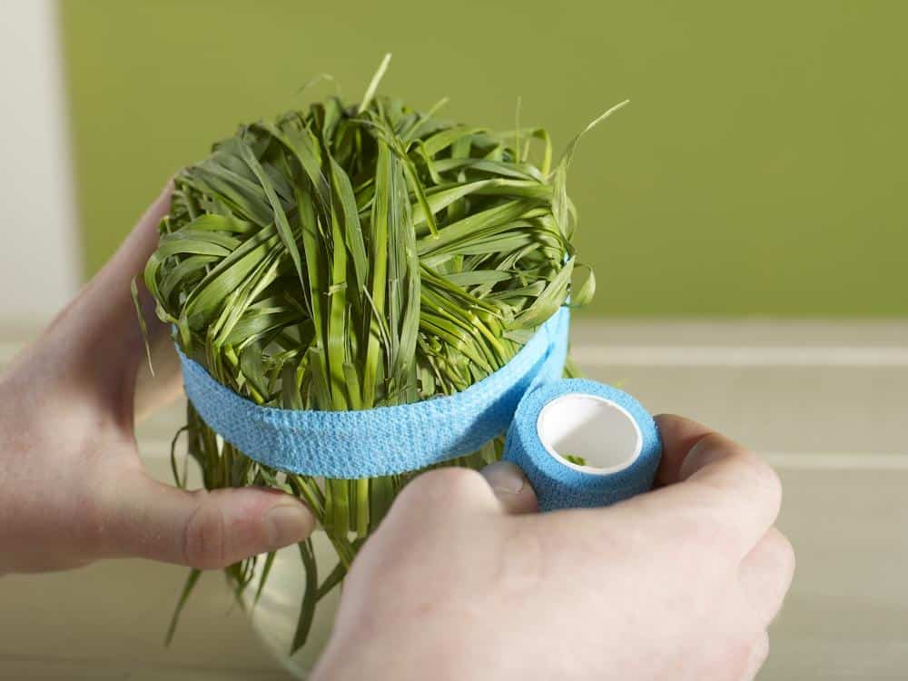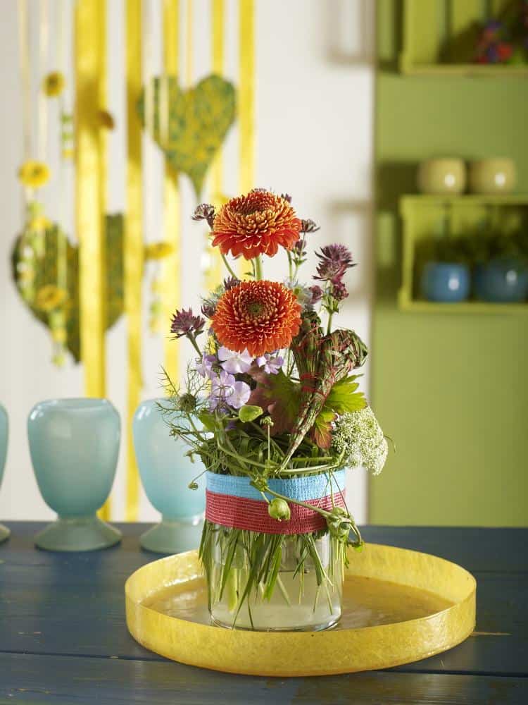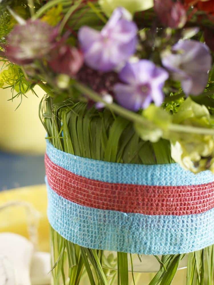 Gefäß mit Wasser füllen und Gräser kreuz und quer über die Gefäßöffnung legen. Deren Enden an der Gefäßaußenseite nach unten biegen und die Gräser wie einen Grasdeckel über der Gefäßöffnung mit Pflasterband fixieren. Blüten durch diesen Grasdeckel hindurch stecken, so dass er als Steckhilfe dient. Herz aus Wiesengras formen, mit rotem Nähgarn umwickeln und am Strauß fixieren.