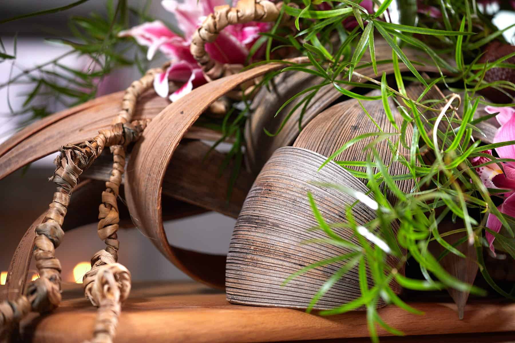 Schwungvolle Schalen der Cocos nucifera und mit Eichhornia crassipes ummantelte Sisalstricke stehen symbolisch für ein Leben voller Ereignisse. Die Wasserhyazinthen lassen sich am besten im feuchten Zustand um den Strick winden, dadurch entsteht die interessante Rankenoptik. Die zarten Pastellfarben der Blütenauswahl bilden einen harmonischen Kontrast zu den warmen, erdigen Farben der verholzten Pflanzenteile und dem Sarg.