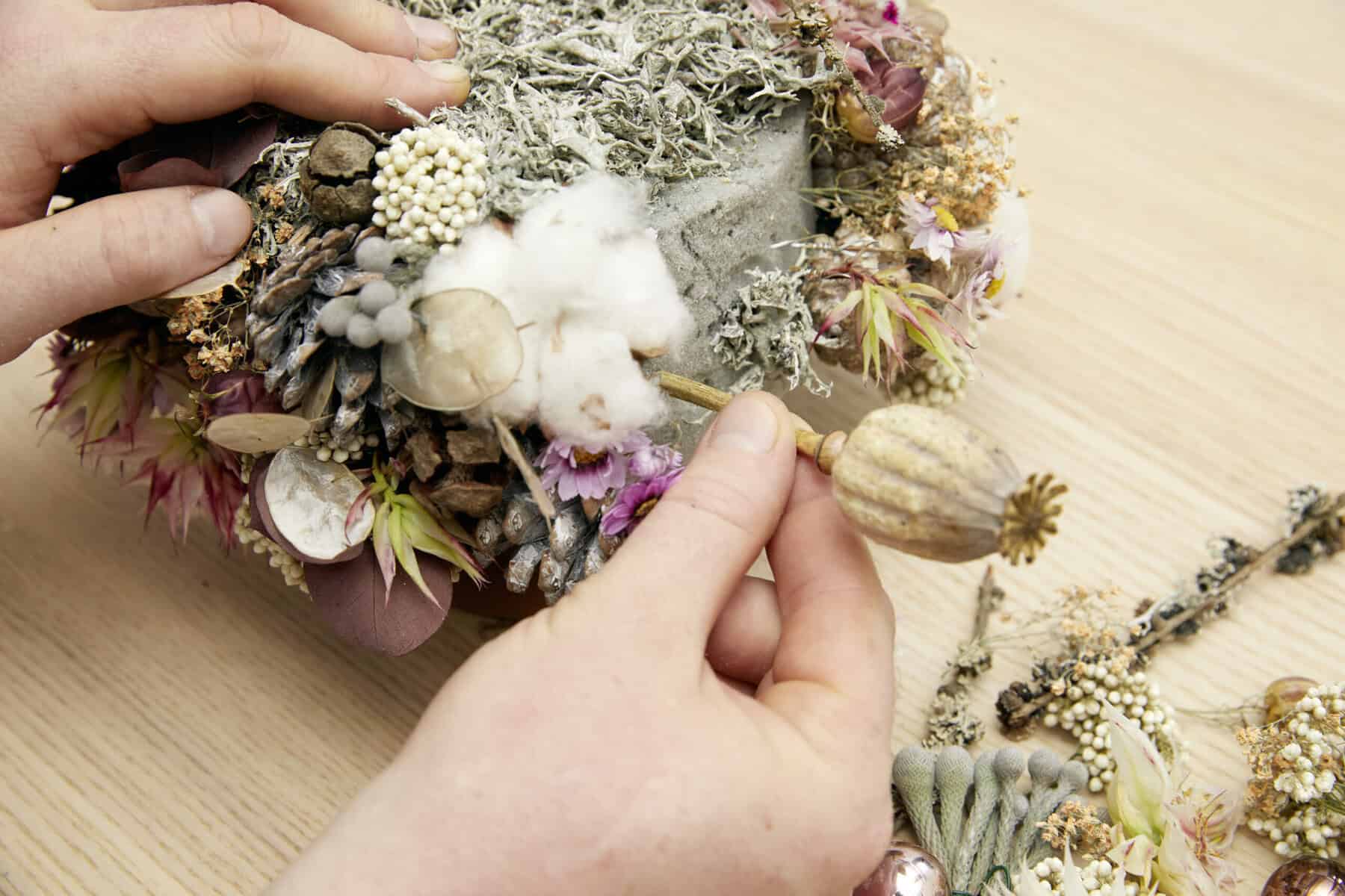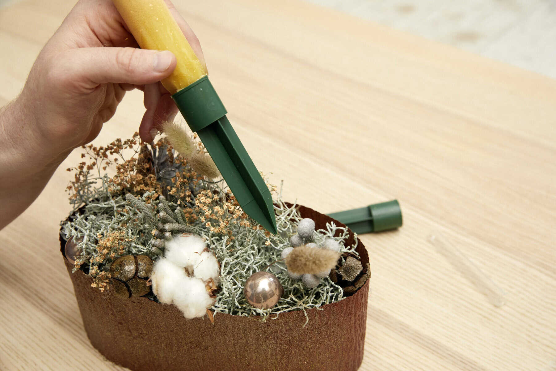 SEC-Ziegel zuschneiden und die Kanten glatt schleifen. Die Unterseite mit Pappe bekleben und den Rand mit Papier umkleben. Die Lenzrose mit Glimmer-Spray besprühen. Die Basis mit den pflanzlichen Werkstoffen ausstecken. Anschließend Kerzenhalter samt Kerze in den Ziegel stecken. Zum Schluss Glasröhrchen in die Steckmasse einfügen, frische Blüten einsetzen und mit dekorativen Accessoires gestalten.