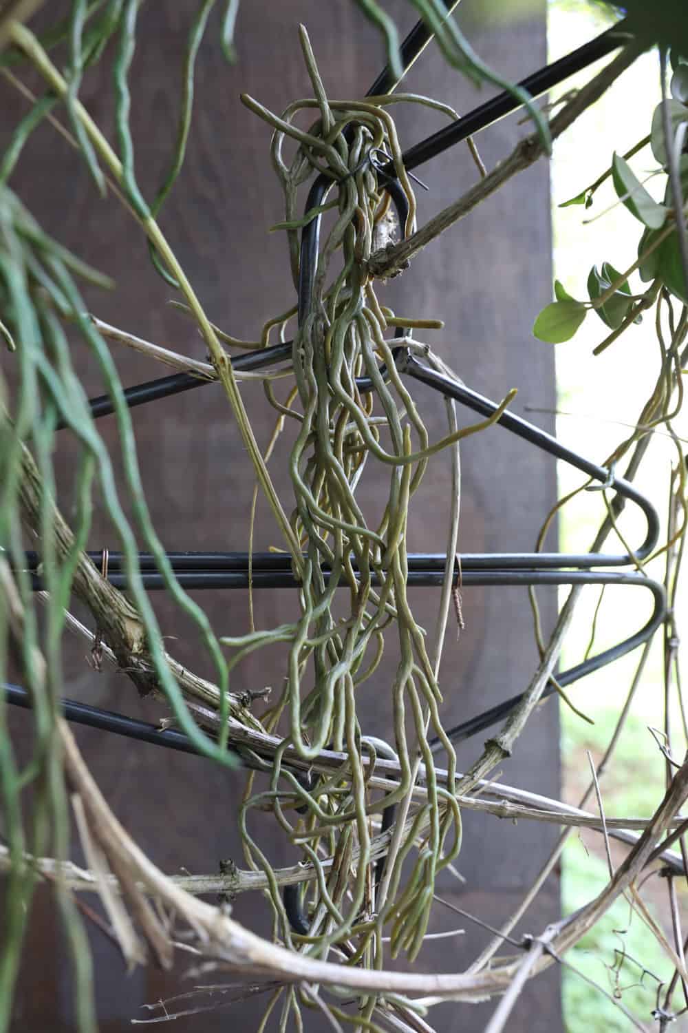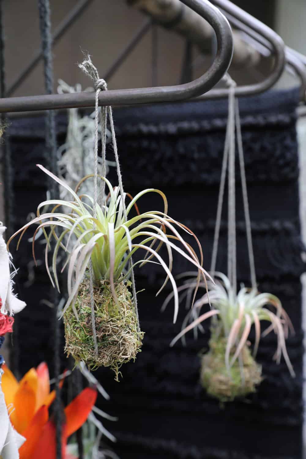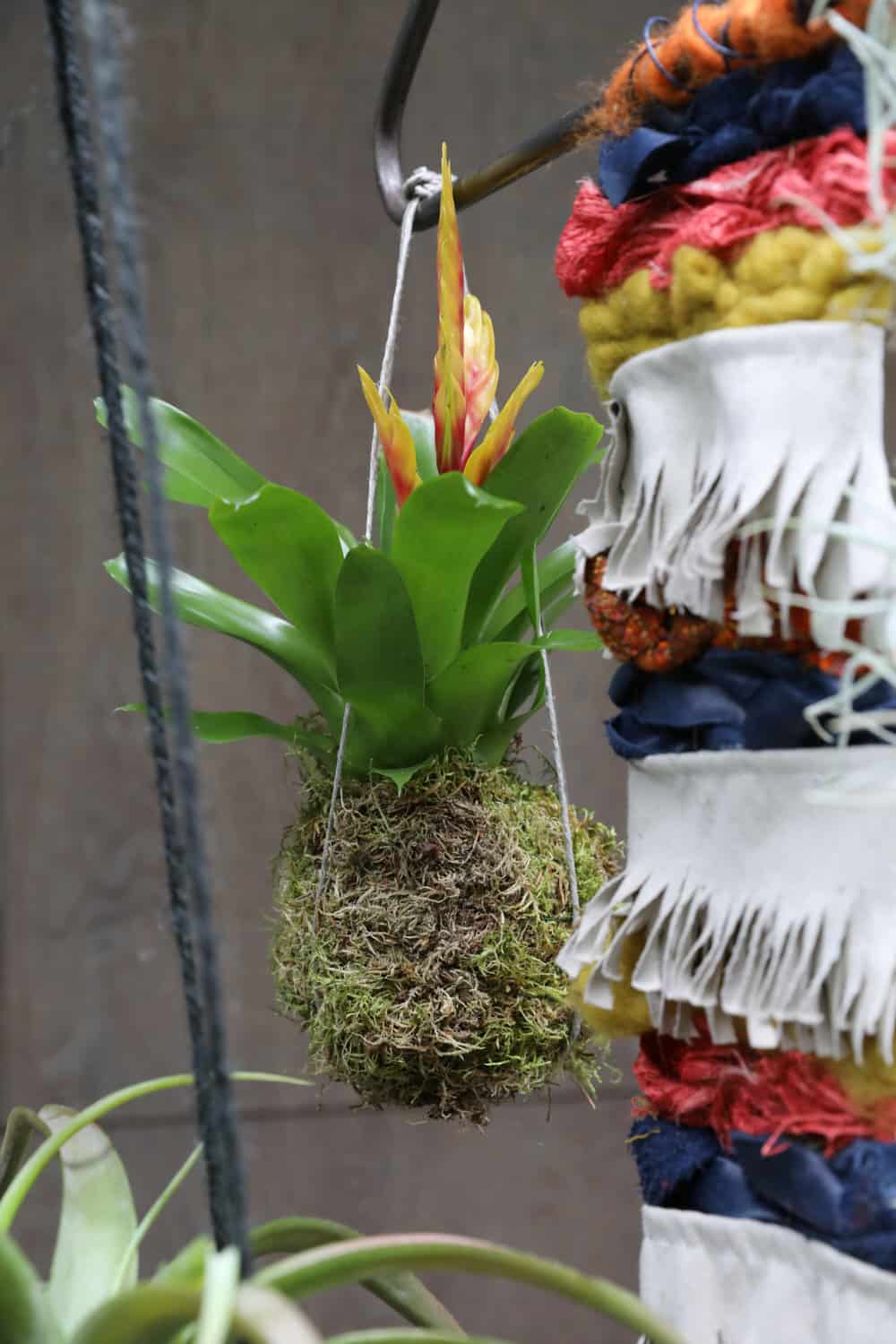 Eine leichte wie frappierende Technik. Basis bilden metallene Liederbügel, an denen vieles aufgehängt und somit an einem Ast befestigt wird. Hier ist vieles möglich und im bunten Mix wirkt es am besten. Die exotischen Pflanzen bringen die Farbtupfer, sie werden jeweils mittel Kokedama-Technik integriert.