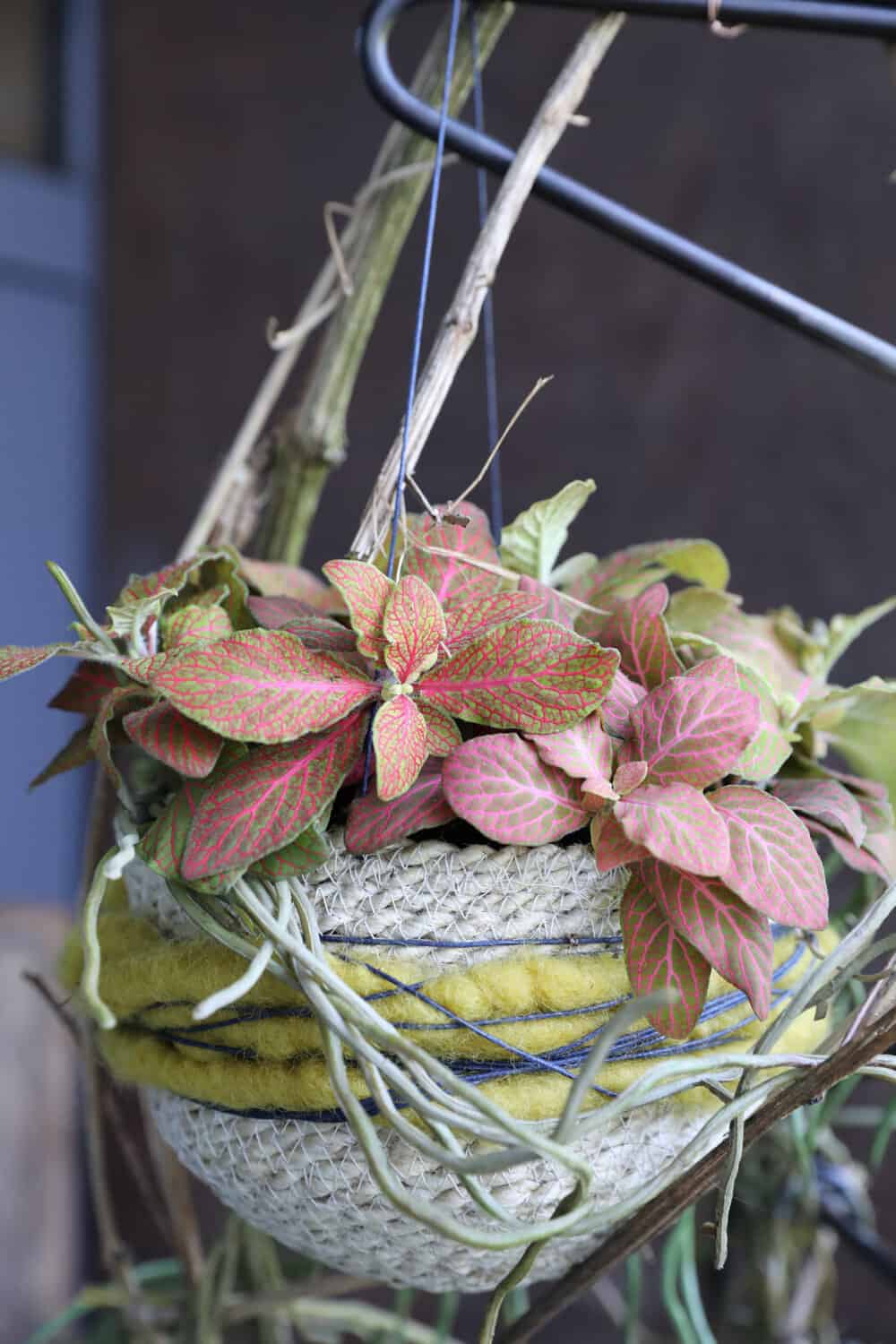 Zunächst die Metall-Kleiderbügel zusammenrödeln, so dass ein Gerüst entsteht. Diese aufhängen und für die natürliche Anmutung mit den Ranken umwickeln. Nun die Körbe mit den exotischen Topfpflanzen bepflanzen und mit bunter Wolle umwickeln. Das wirkt bunt und damit dekorativ. Tillandsienmoos in die Freiräume legen und die Körbe in das Gerüst einarbeiten, so dass ein großes Mobile entsteht.