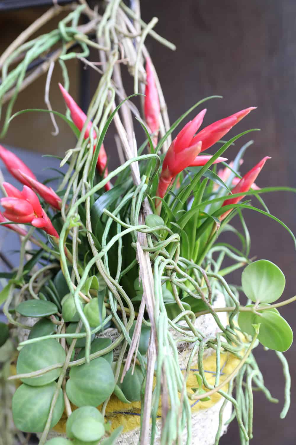 Kompakter und an die früheren Bromelienbäume erinnern wirkt dieses Arrangement. Die einzelnen Pflanzen finden sich in kleinen rundlichen Bastmattenkörben und werden frei in ein Konstrukt aus aneinander gedrahteten Bügeln gehängt. Auf für Treppenhäuser oder hohe Räume ist dieses Arrangements geeignet.
