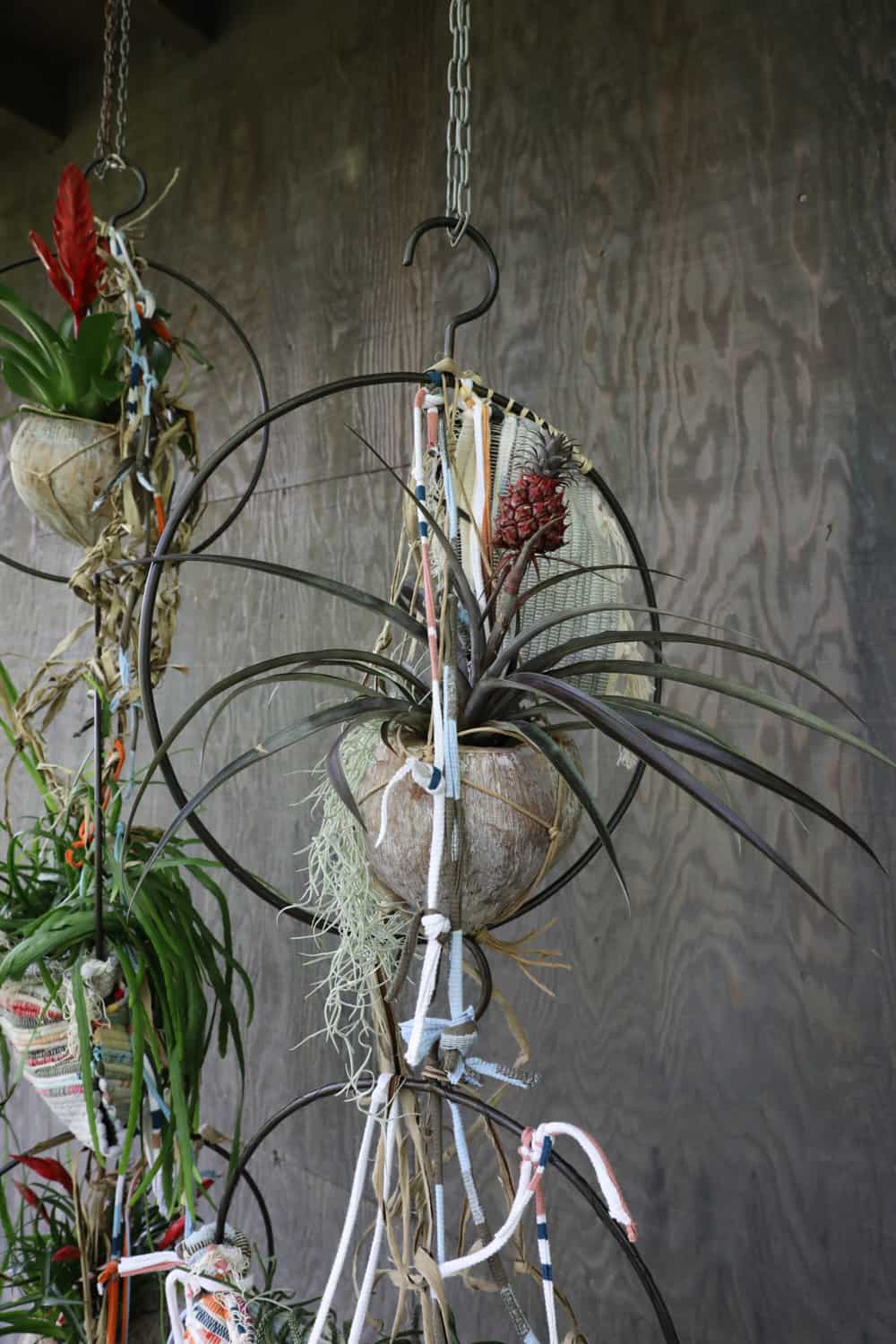 Den Webteppich zerschneiden und daraus kleine Tasche zusammennähen. Diese mit Folie auslegen und die Pflanzen einsetzen. Die Taschen nun in den rundlichen Kleiderbügel befestigen. Die Bromelien wiederum in die Kokosnussschalen einpflanzen, mit Tillandsienmoos ausstatten und ebenfalls in die Bügel einhängen. Alle Bügel nun mittels Ketten aufhängen und mit Maulbeerbaumrinde und Streifen vom Webteppich ausschmücken.