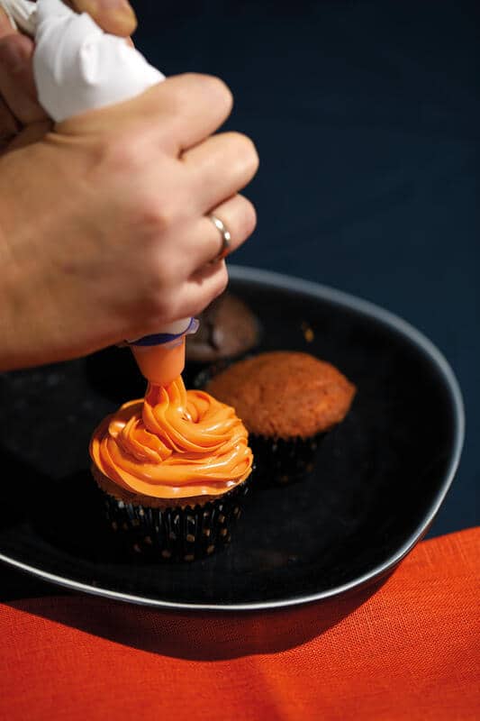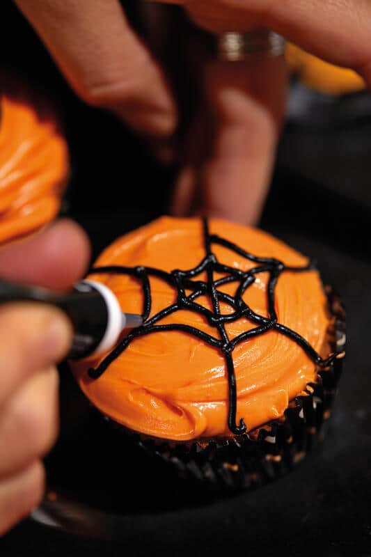 Frosting in einen Spritzbeutel geben und die abgekühlten Muffins kreisförmig mit dem Frosting versehen. Für die Dekoration mit dem schwarzen Lebensmittel- Farbstift ein Spinnennetz aufzeichnen und eine Kunststoff-Spinne aufsetzen.