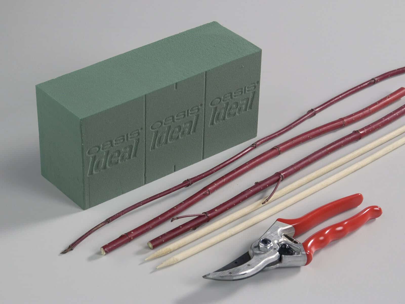 1. Um einen Frischblumensteckschaum-Ziegel optimal auszunutzen, kann man den Gefäßrand kurz und leicht auf den Steckblock drücken. Dort, wo sich die durch den Gefäßrand abgezeichneten Kreise überschneiden, sind nun die passenden Schnittlinien erkennbar, die hier den Block in drei Teile zerlegen. Statt die Schnitte ganz am Rand der abgezeichneten Kreise zu setzen, sind die gezeigten Überschneidungen möglich, weil der Steckschaum ohnehin nicht das ganze Gefäß ausfüllen soll, sondern zum Nachfüllen von Wasser seitlich Platz verbleiben muss. Lediglich die Eckkanten der schließlich ins Gefäß gesetzten Steckschaumbasis berühren, wie im Folgenden zu erkennen, die Gefäßwand und führen zu festem Sitz des Blocks im Gefäß.