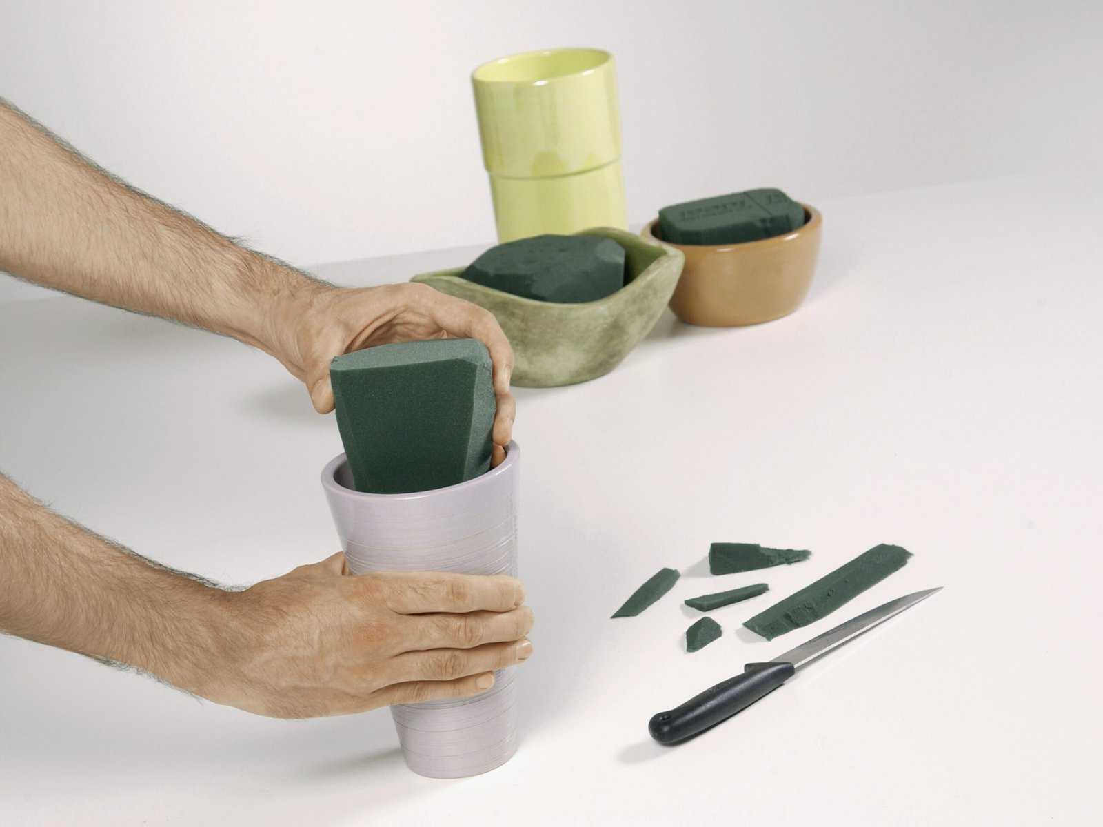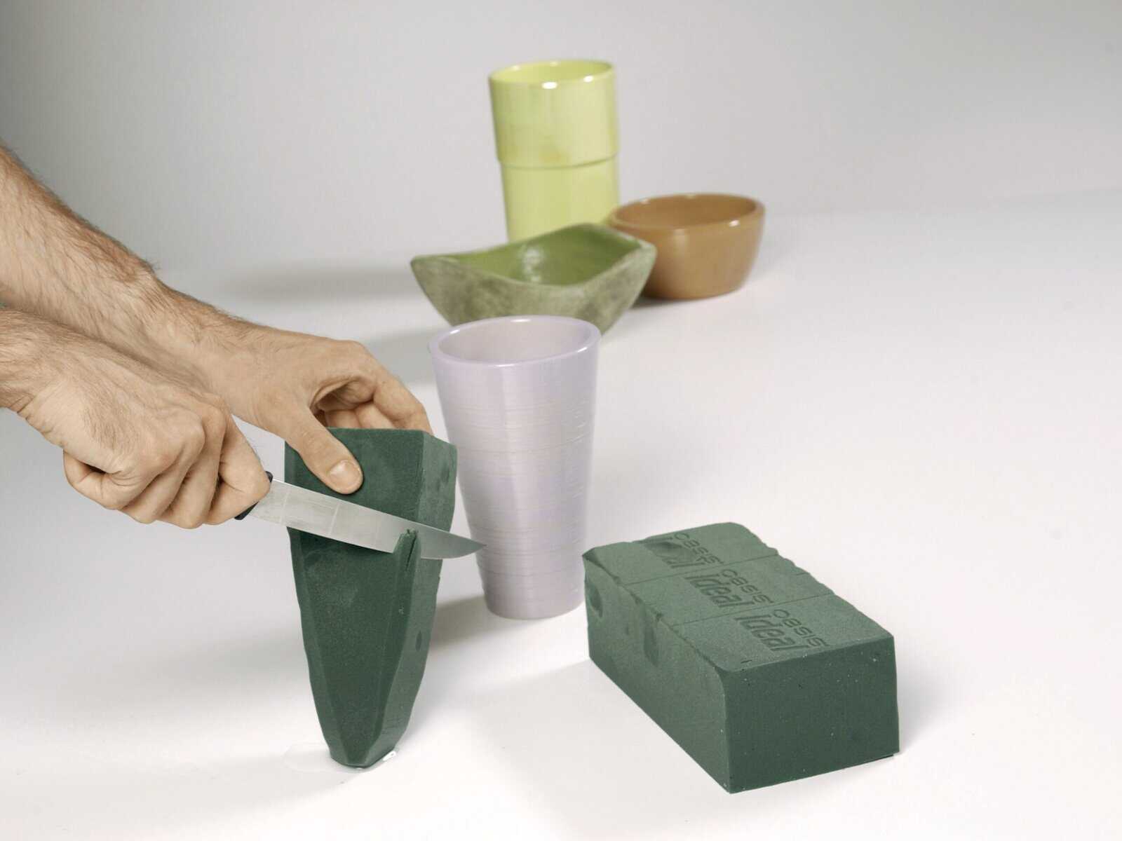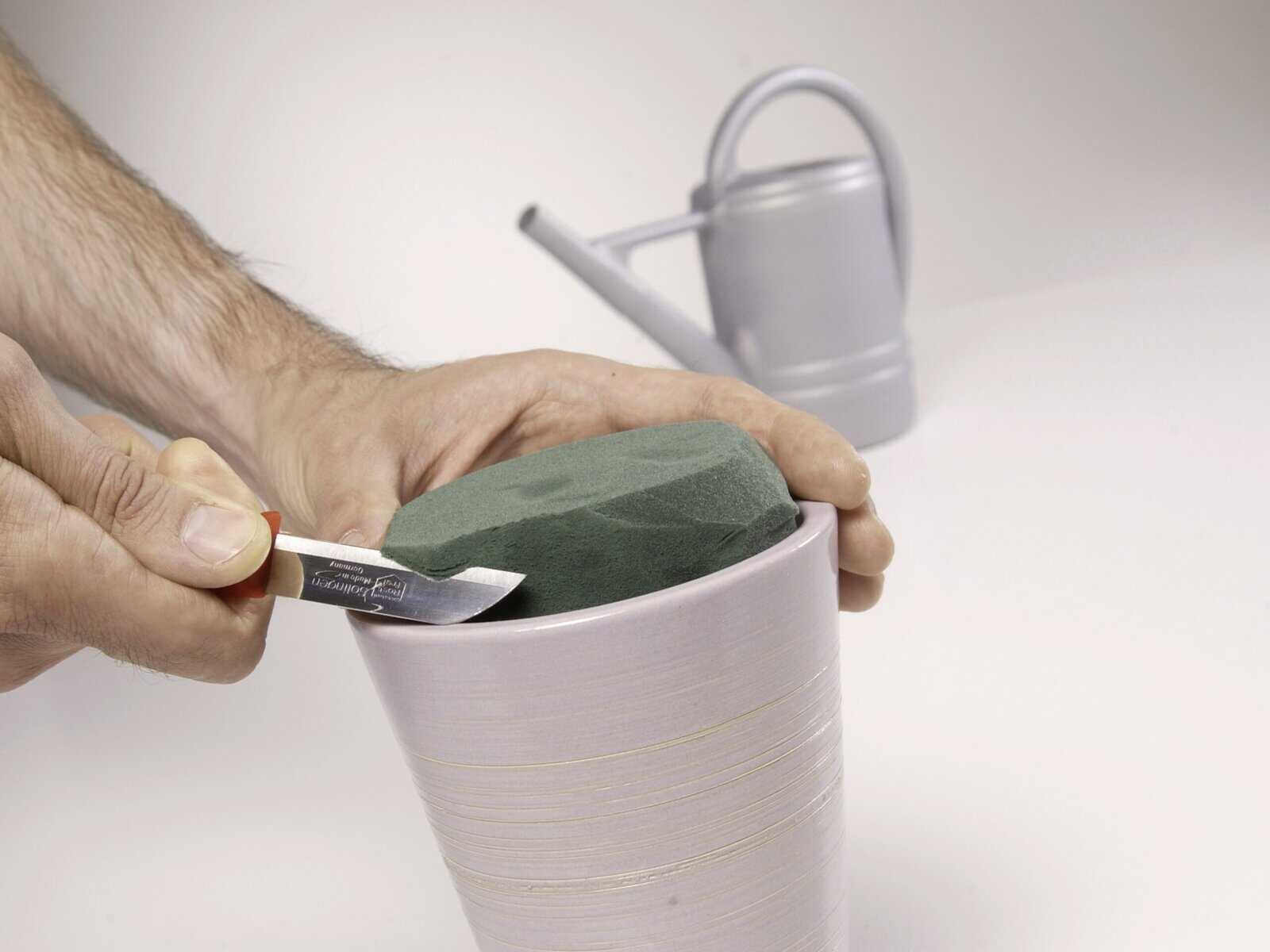 2. Der Steckschaumblock wird nun für das ausgewählte Gefäß zurechtgeschnitten. Hier ist außerdem zu sehen, dass für ein hohes Gefäß auch ein Zuschneiden des Steckschaums in Längsrichtung des Ziegels erforderlich sein kann. Nochmals ist daran zu denken, dass Platz bleiben muss, um später leicht Wasser nachfüllen zu können. Bei einem vollständig mit Steckschaum ausgefüllten Gefäß würde nachzufüllendes Wasser sofort seitlich überlaufen.