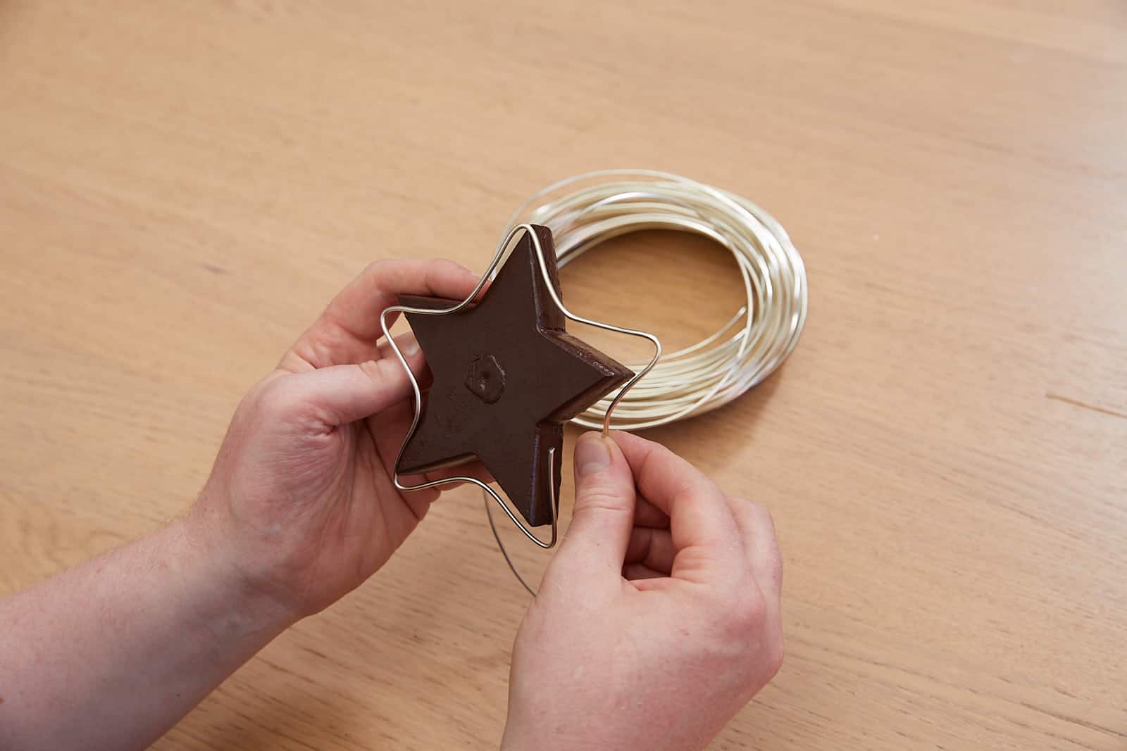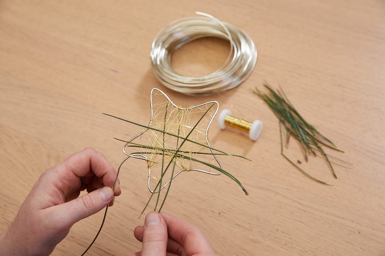 Zweige in gewünschte Länge schneiden, zu einem Rahmen fertigen. Draht abspulen, draus zwei flache Dreiecke formen, zu einem Stern verbinden. Stern mit Zapfen und Lichterkette umwickeln. Kiefernadeln in Stern einstecken. Stern in Rahmen einsetzen. Band und Kugel ergänzen.