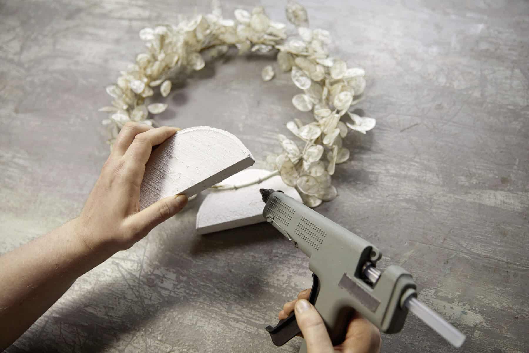 Das Silberblatt nach und nach mithilfe von Zierdraht auf den Dekoring wickeln, dabei unten eine Stelle für den Standfuß freilassen. Die Holzscheibe mittig durchsägen und mit Farbe anstreichen. Nach dem Trocknen den Dekoring mit der freien Stelle auf eine Hälfte legen und mit Krampen fixieren. Die andere Hälfte mit Heißkleber anbringen, sodass ein Standfuß entsteht. Zum Schluss den Kranz aufstellen und Schmuckband befestigen.