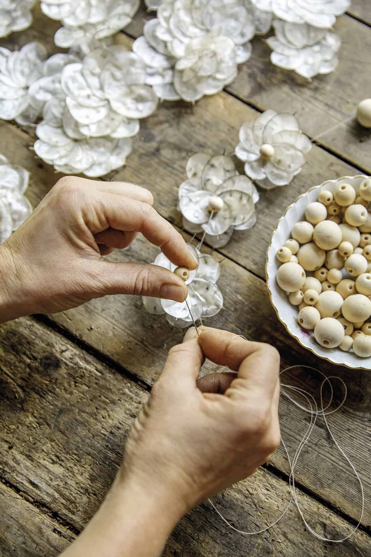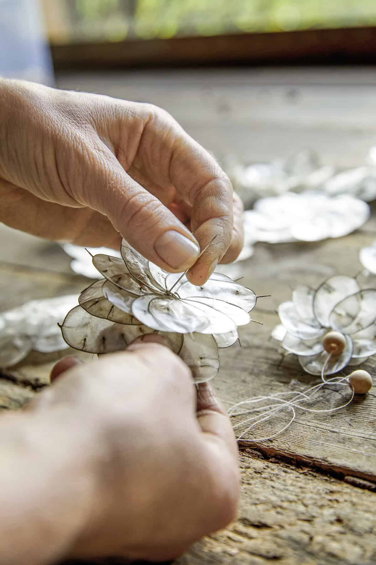 Hier kommen Blüten aus Silberblatt zum Einsatz, die aufgefädelt und mit einer Perle versehen durch ihre Dreidimensionalität faszinieren. Als raffinierte Girlanden stellen sie einen zeitlosen Fensterschmuck dar.