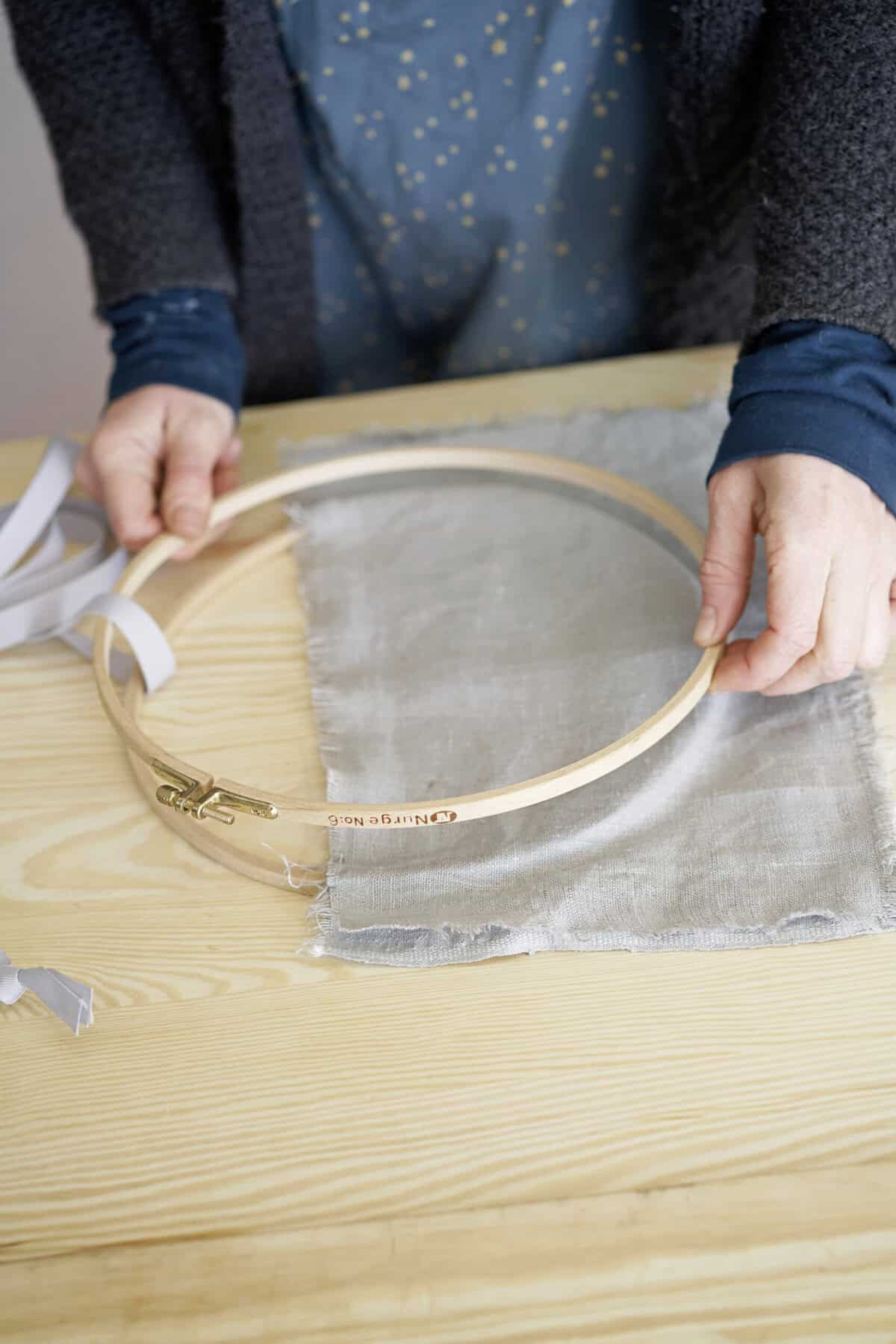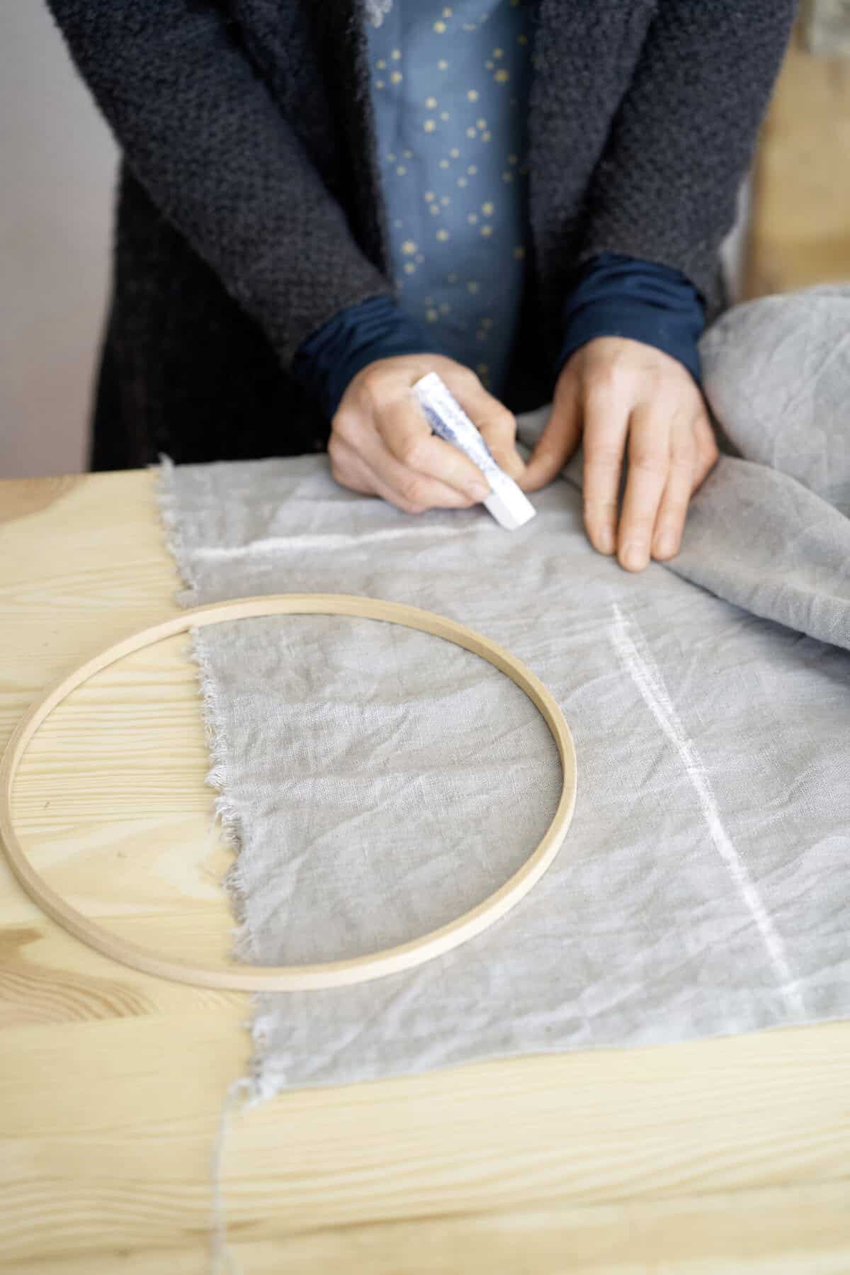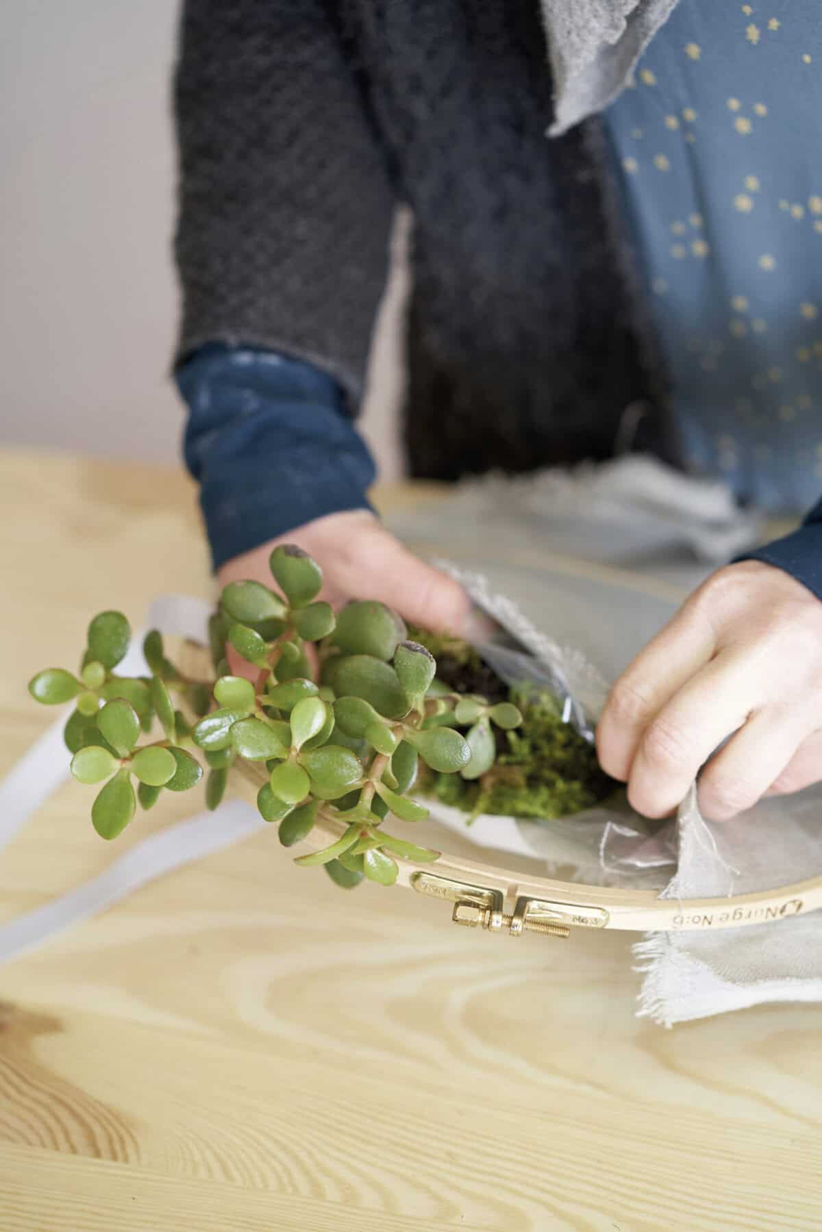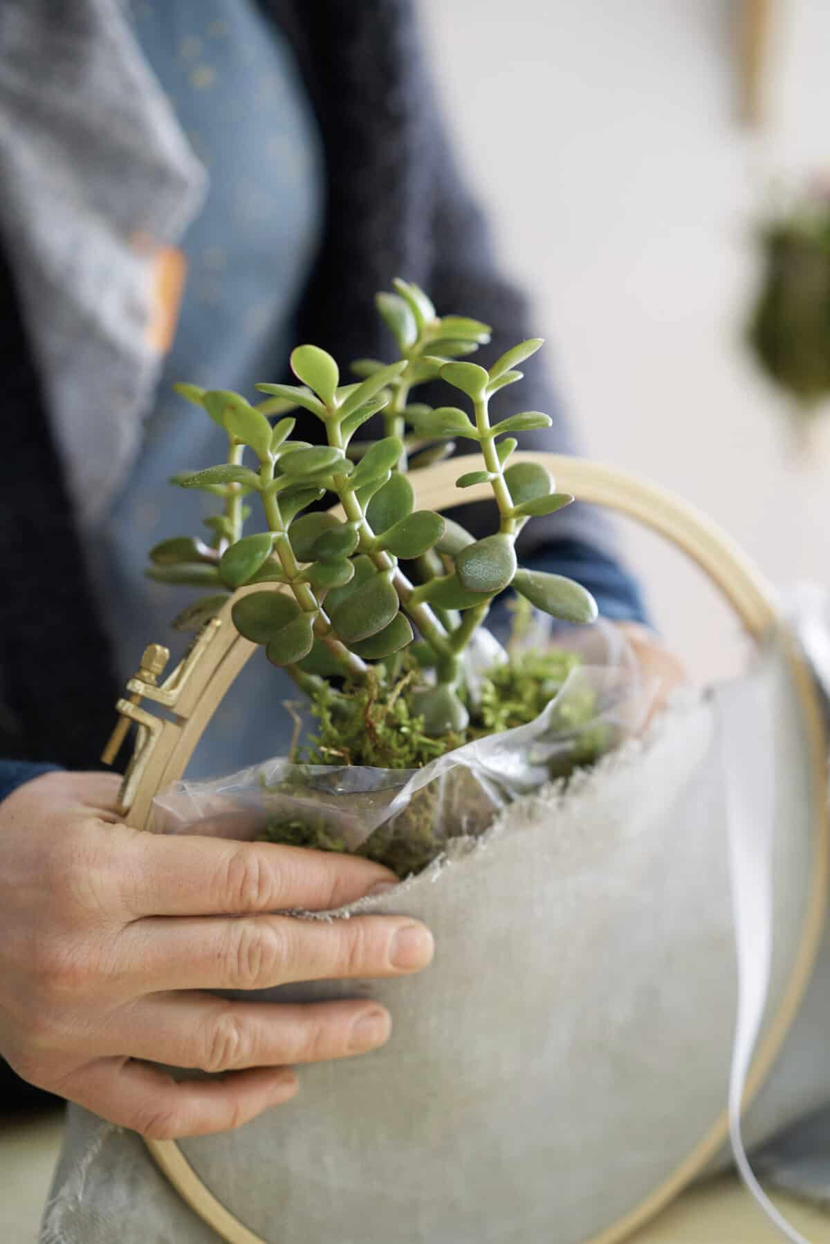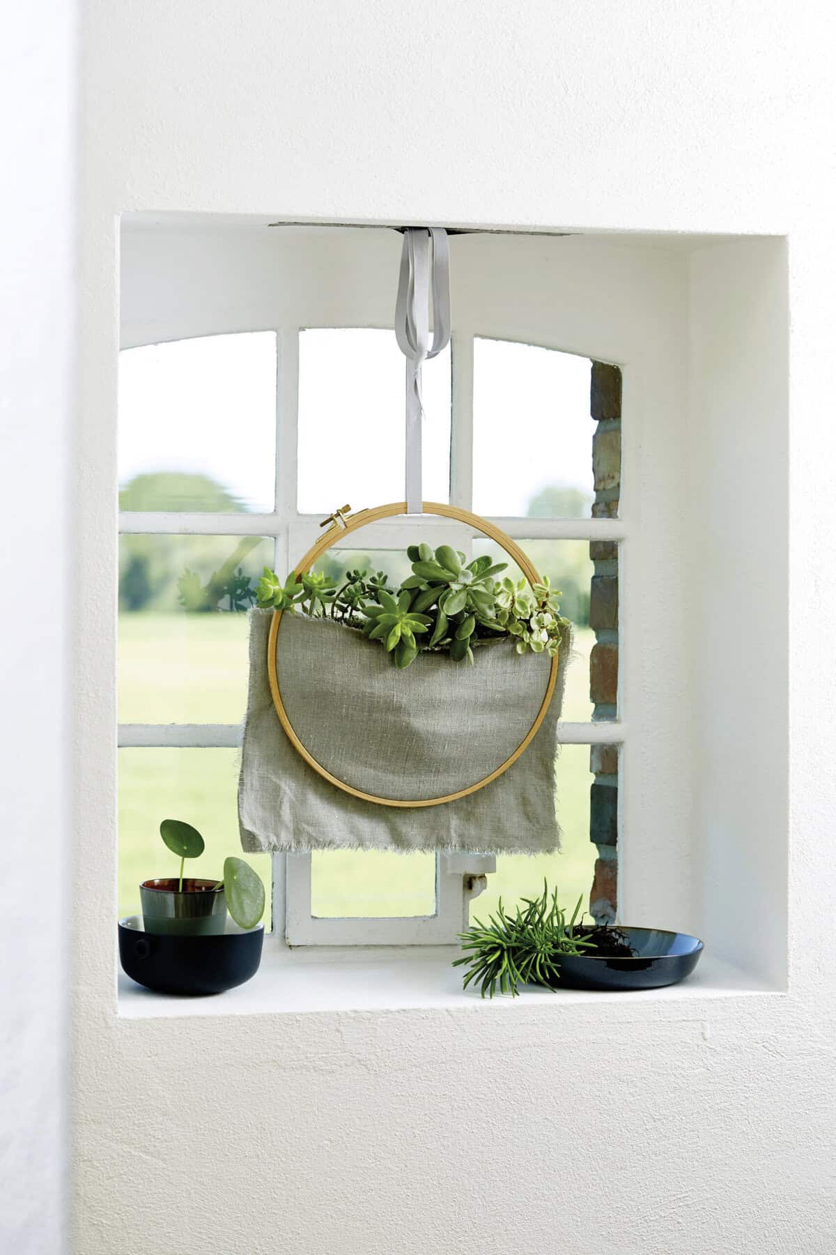 Den Stoff mit Kreide in der gewünschten Größe anzeichnen, zurechtschneiden und so in den Stickrahmen einspannen, dass oben eine Öffnung entsteht. Das Stofffach innen mit Folie auslegen, damit es wasserfest ist. Pflanzerde einfüllen und den Mauerpfeffer einpflanzen. Zum Schluss mit einem langen Band aufhängen.