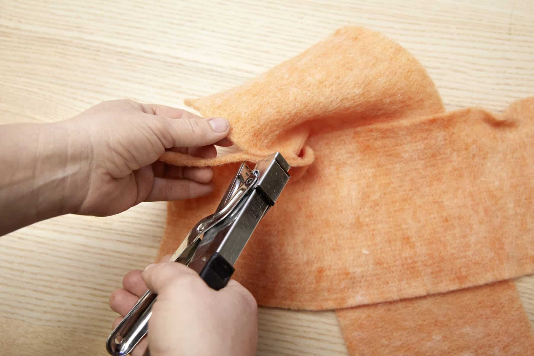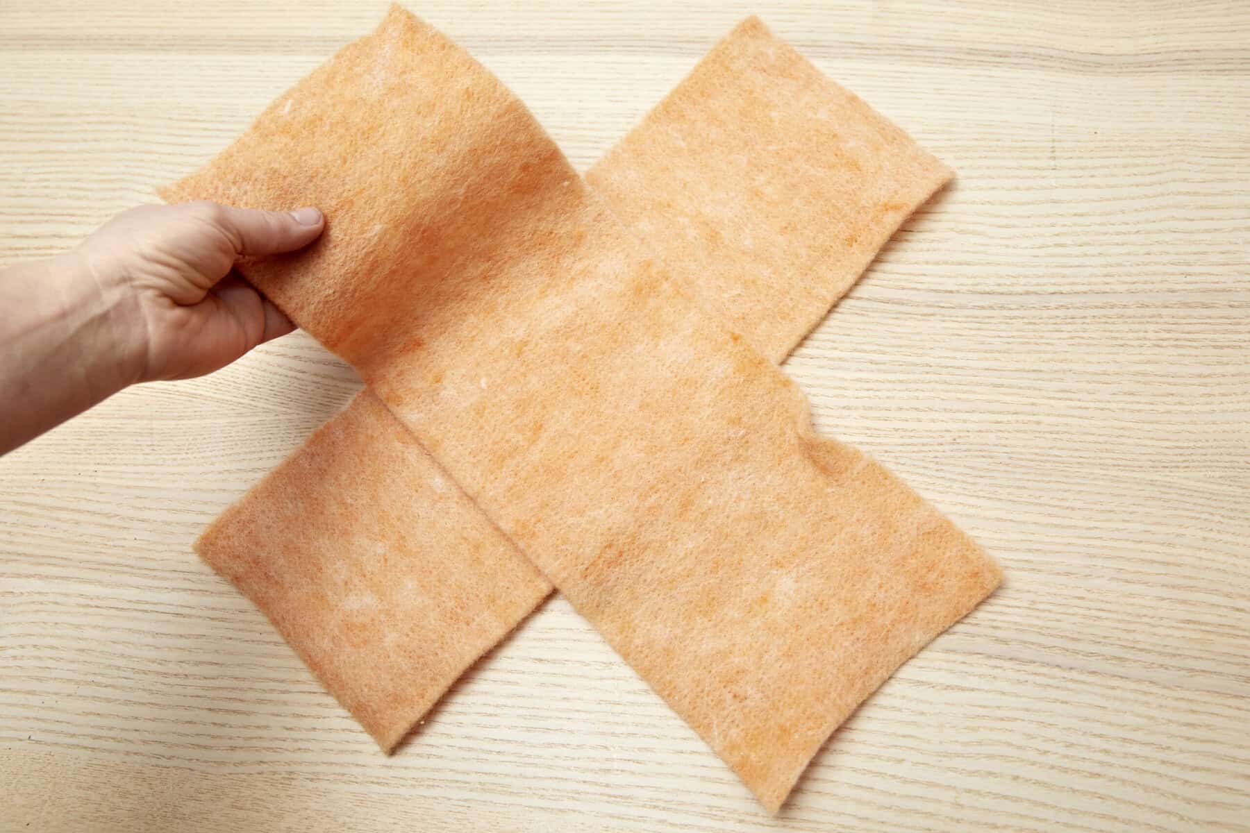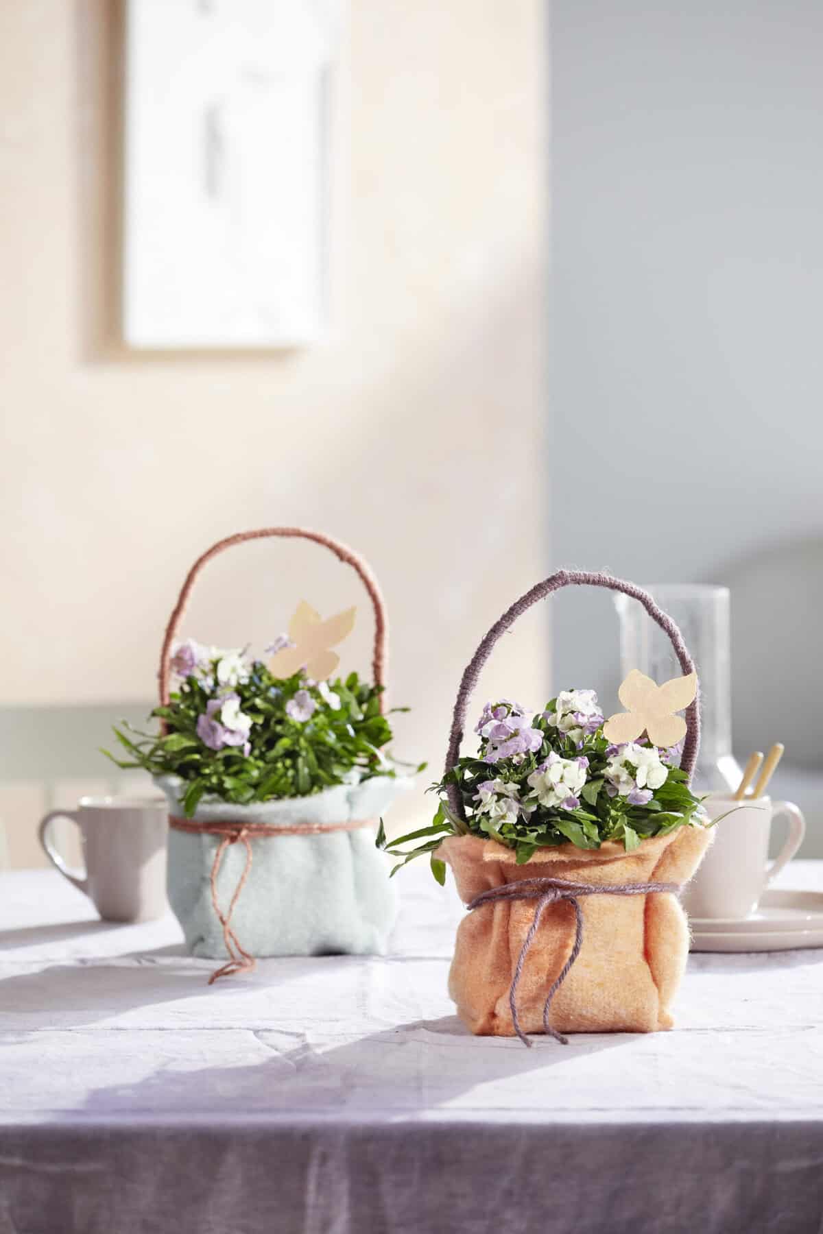Zwei Stücke Wollfilz kreuzförmig übereinanderlegen und mit Tackernadeln fixieren. Die kurzen Seiten an der Innenseite festtackern, sodass eine Tasche entsteht. Die Pflanze im Folienbeutel in die Tasche einstellen. Einen Flachdraht mit Schnur umwickeln und als dekorativen Henkel in die Tasche einkleben. Zum Schluss die Schnur um den Rand der Tasche legen und festknoten sowie nach Belieben einen Schmetterlingsstecker ergänzen.