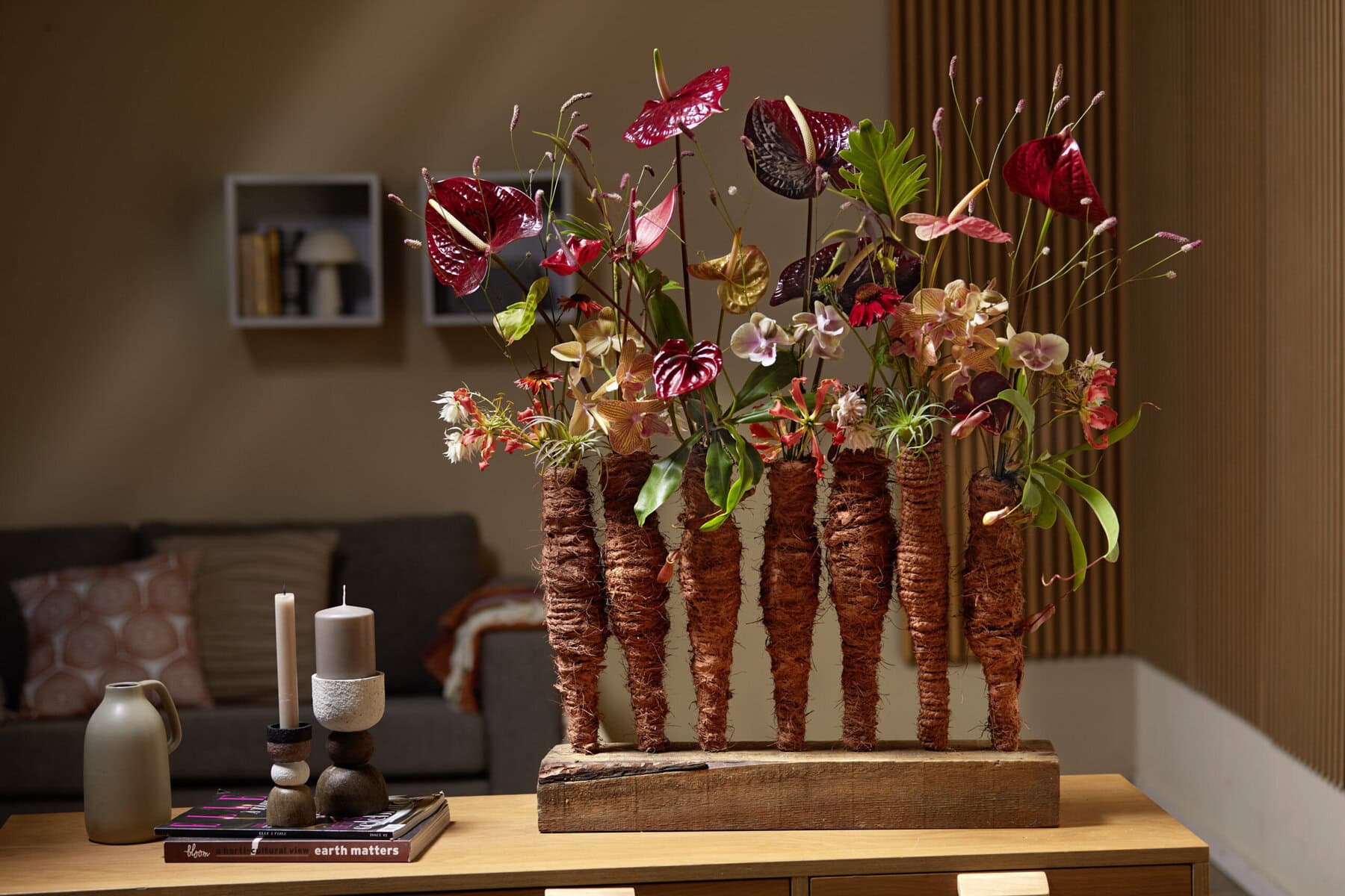 Raue, handwerklich gestaltete Kokons in erdigen Tönen bilden die Basis dieser floralen Raumobjekte. Sie werden individuell geformt und mit ausgewählten Blütenakzenten gefüllt, die punktuell aus den Strukturen herausbrechen und die Blicke der BetrachterInnen auf sich ziehen. So entsteht ein Arrangement, das natürliche Rohheit mit lebendiger Inszenierung verbindet.