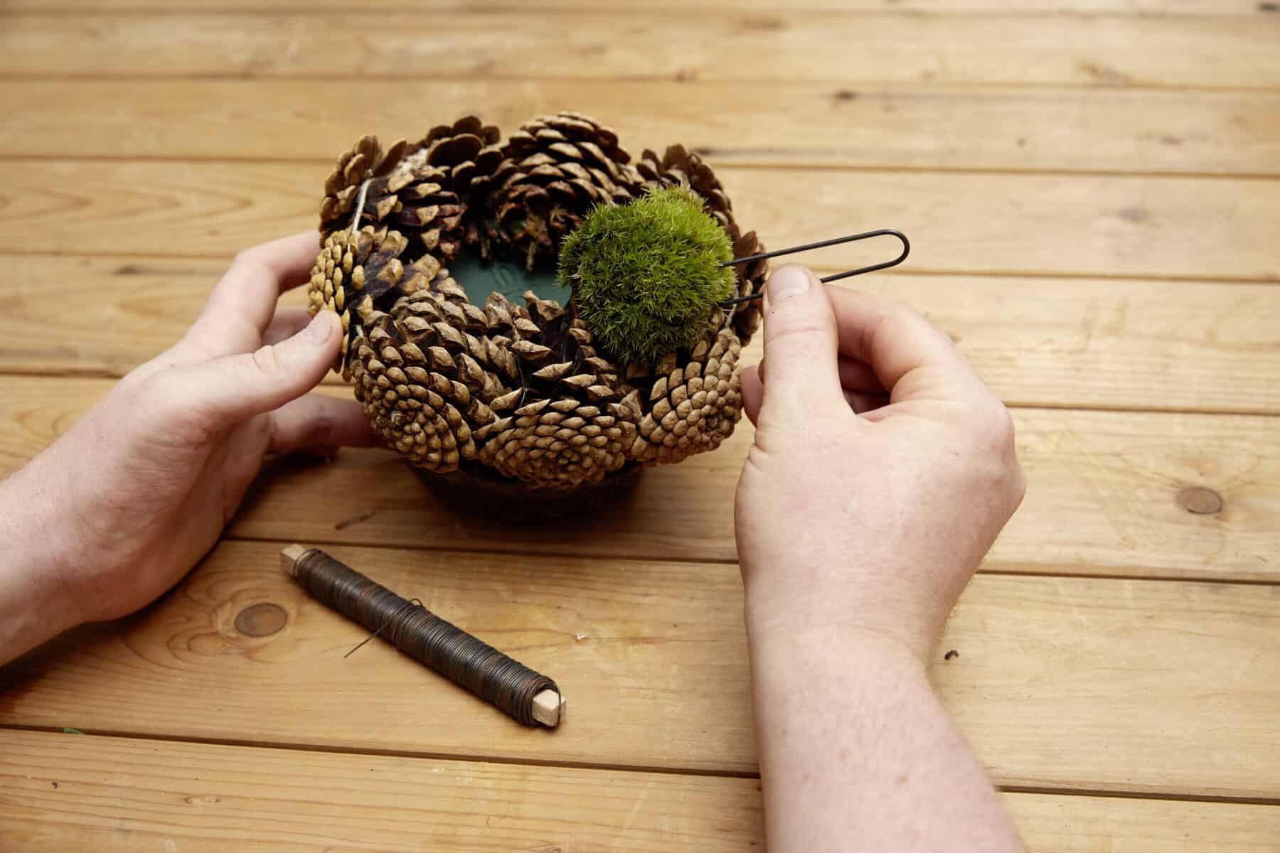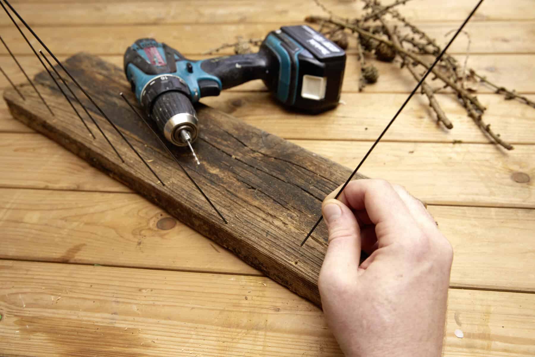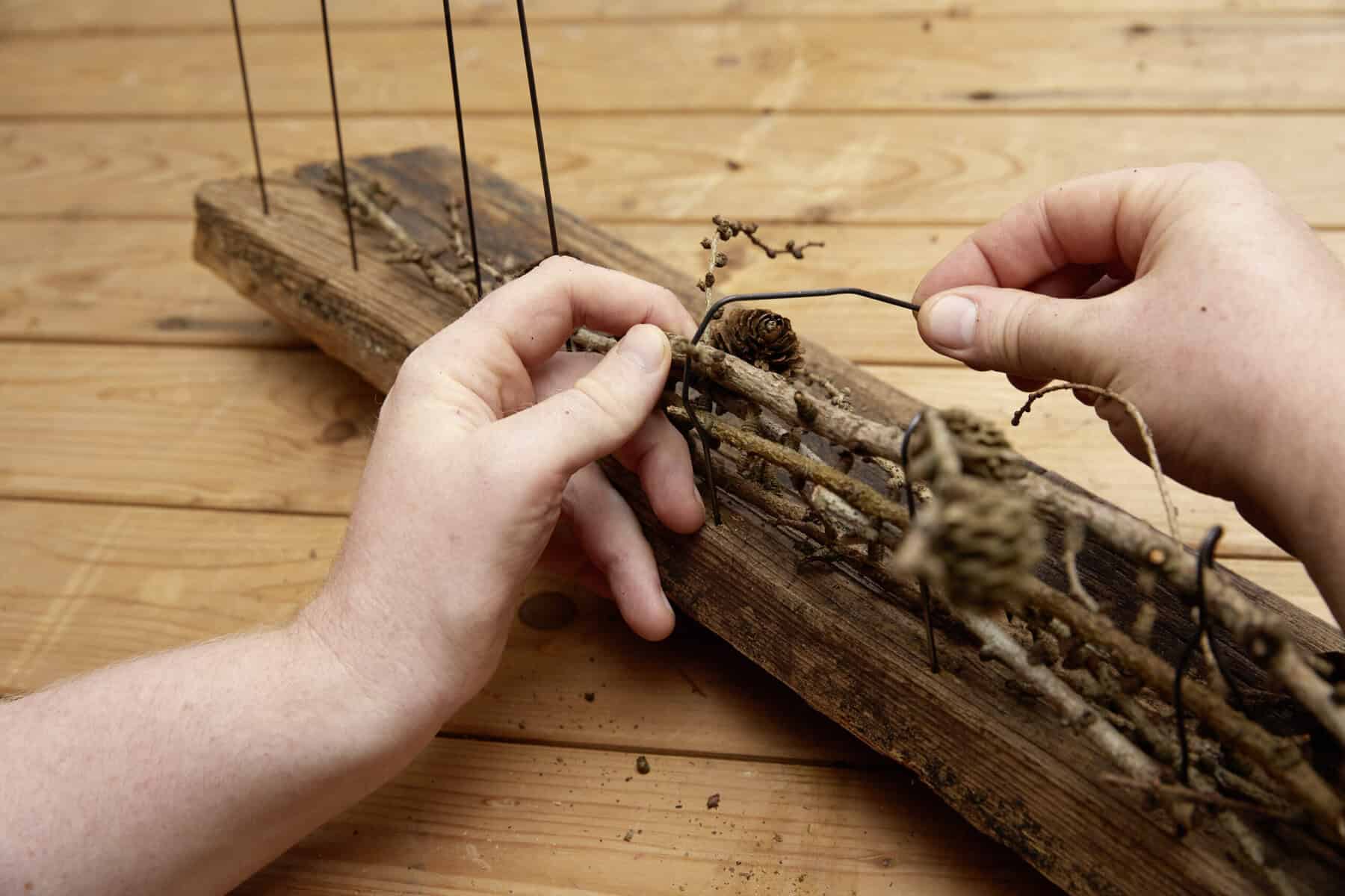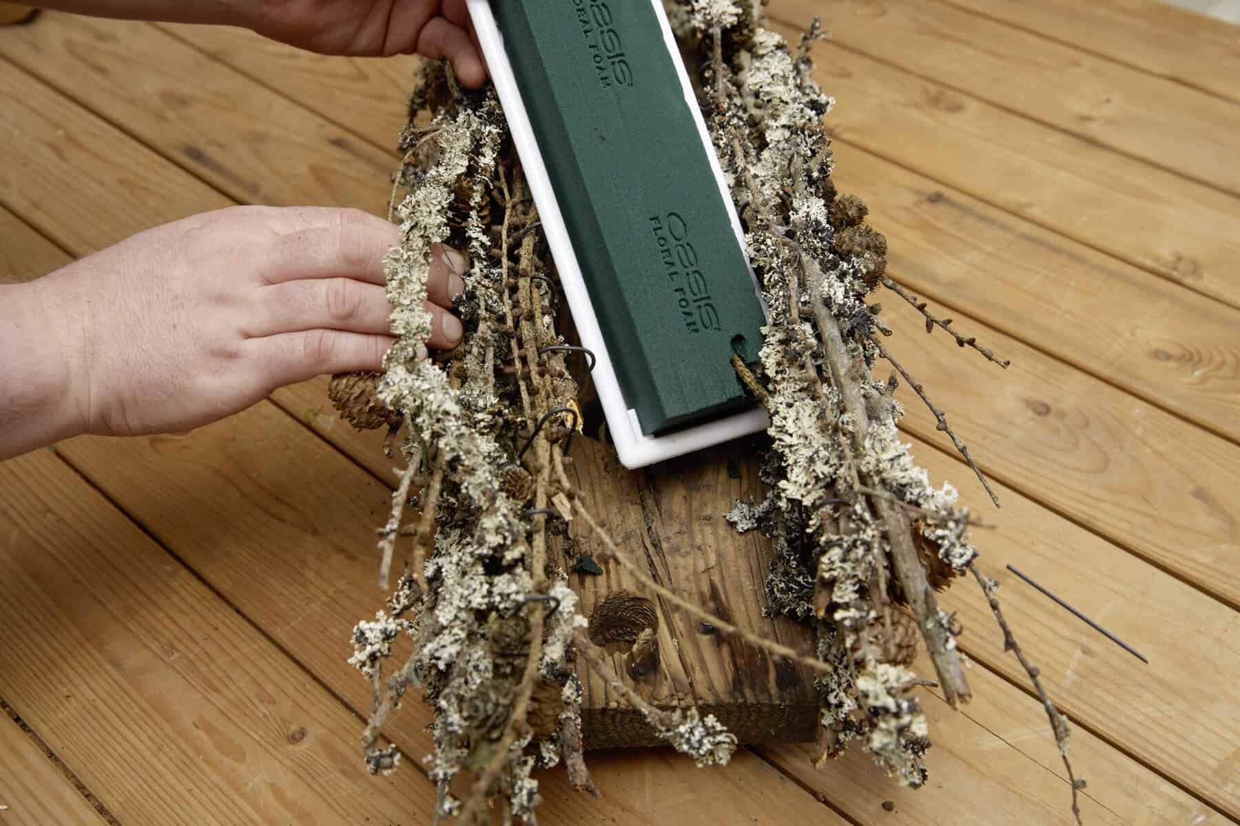 Löcher entlang der Bohle bohren und Drahtstücke fixieren. Holzleisten unterseitig anschrauben, damit die Bohle stabil steht. Draht abwinkeln, Flechten- und Lärchenzweige einweben, Enden umbiegen. Einige Zweige einkleben, um Drahtstellen abzudecken. Trockenblumensteckschaum wässern und platzieren. Flechtenrand überlappend andrücken, Floralien einarbeiten, Zapfen fixieren und Stern ergänzen.