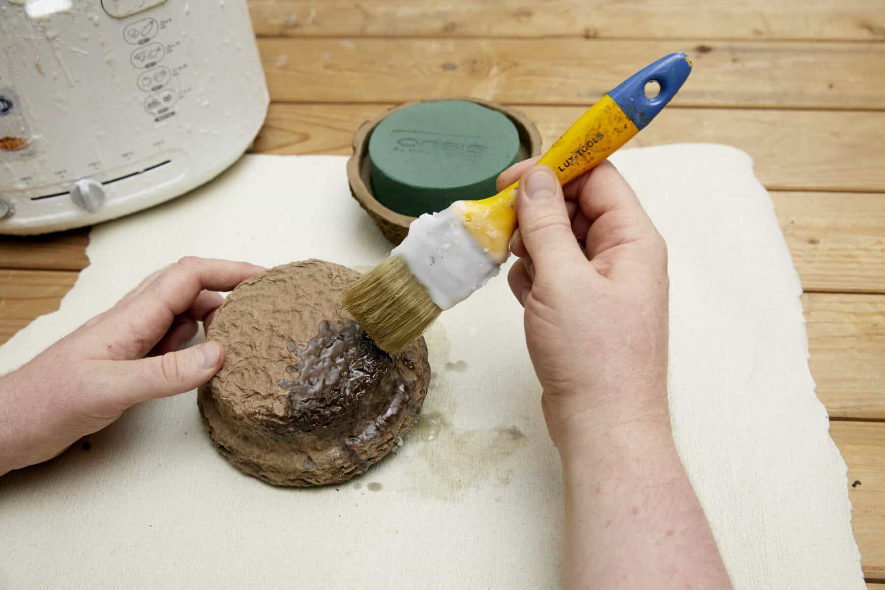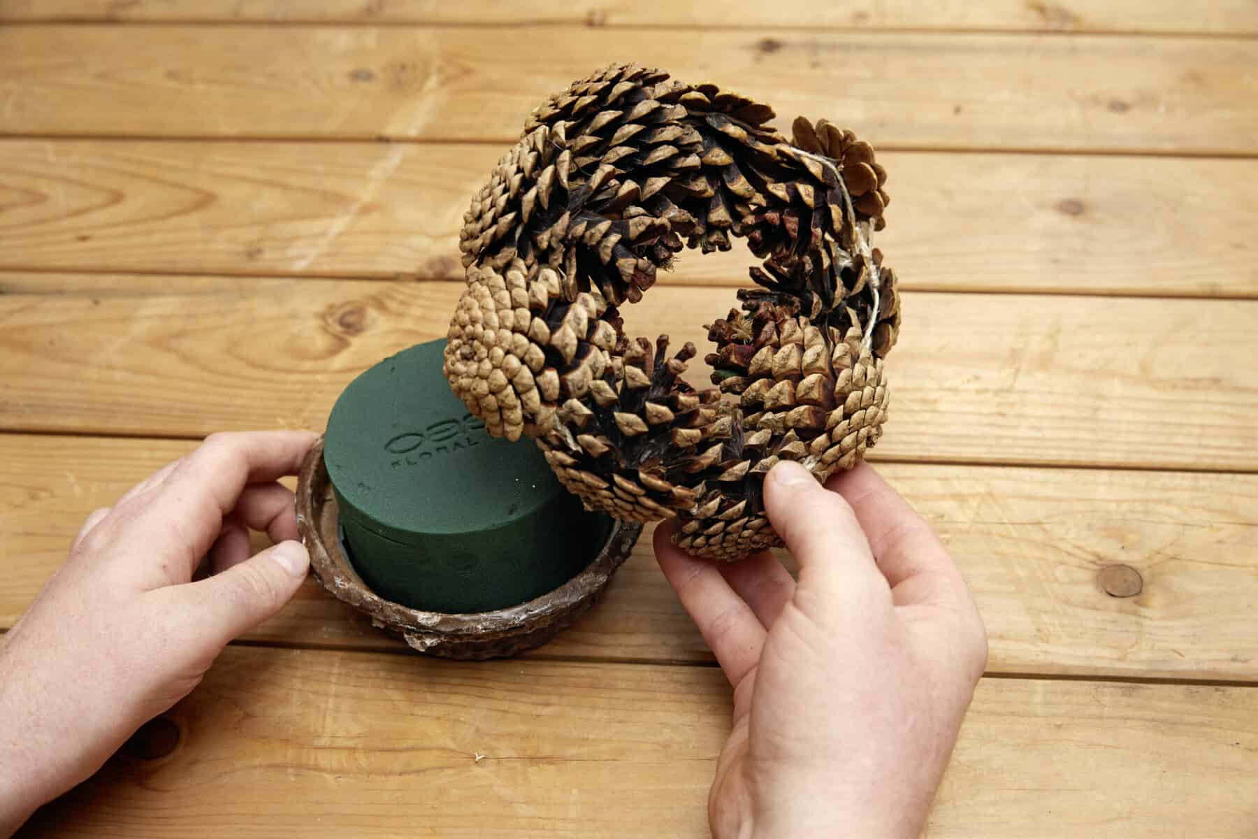Wachs schmelzen und die Außenseite der Frischblumensteckschaum-Schale bestreichen, so wird sie wasserdicht. Steckunterlage wässern. Zapfen zu einem Ring binden und auf den Schalenrand legen. Bemoosten Ast quer darüberlegen und fixieren. Weißmoos bündeln, mit Wickeldraht zu „Kissen“ abbinden und flächig in die Steckunterlage stecken. Floralien locker einseitig einarbeiten, Kerzenhalter mit Kerze ergänzen.