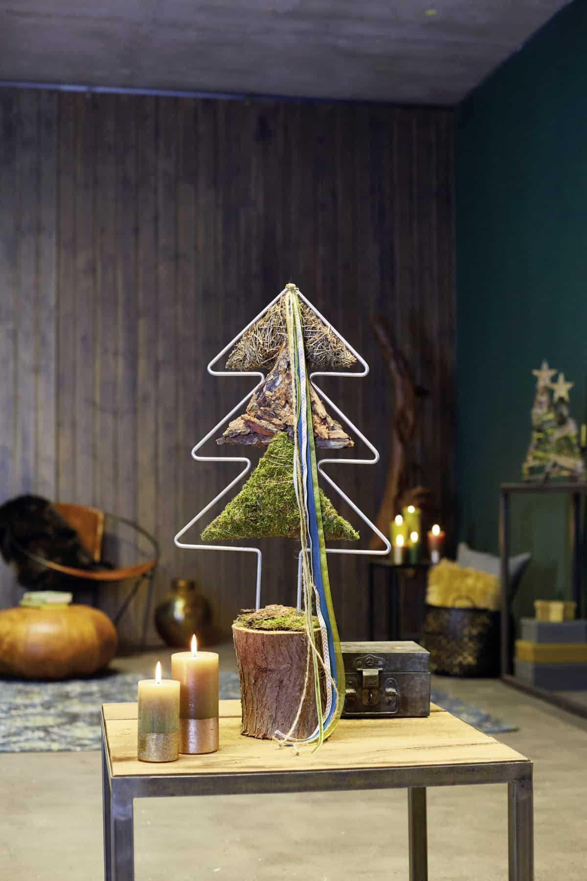 Den Deko-Tannenbaum als Maßstab auf die Pappe legen und Dreiecke aufzeichnen. Diese ausschneiden und mithilfe von Zierdraht mit Moos und Klettenranken bewickeln. Ein weiteres Dreieck mit Rinde bekleben. Den Draht durch die Dreiecke stecken, um diese miteinander zu verbinden. Anschließend die Dreiecke in dem Deko-Tannenbaum fixieren. Schließlich Löcher in den Baumstamm bohren und das Gestell einstecken. Bänder und Schnur an das Gestell knoten.