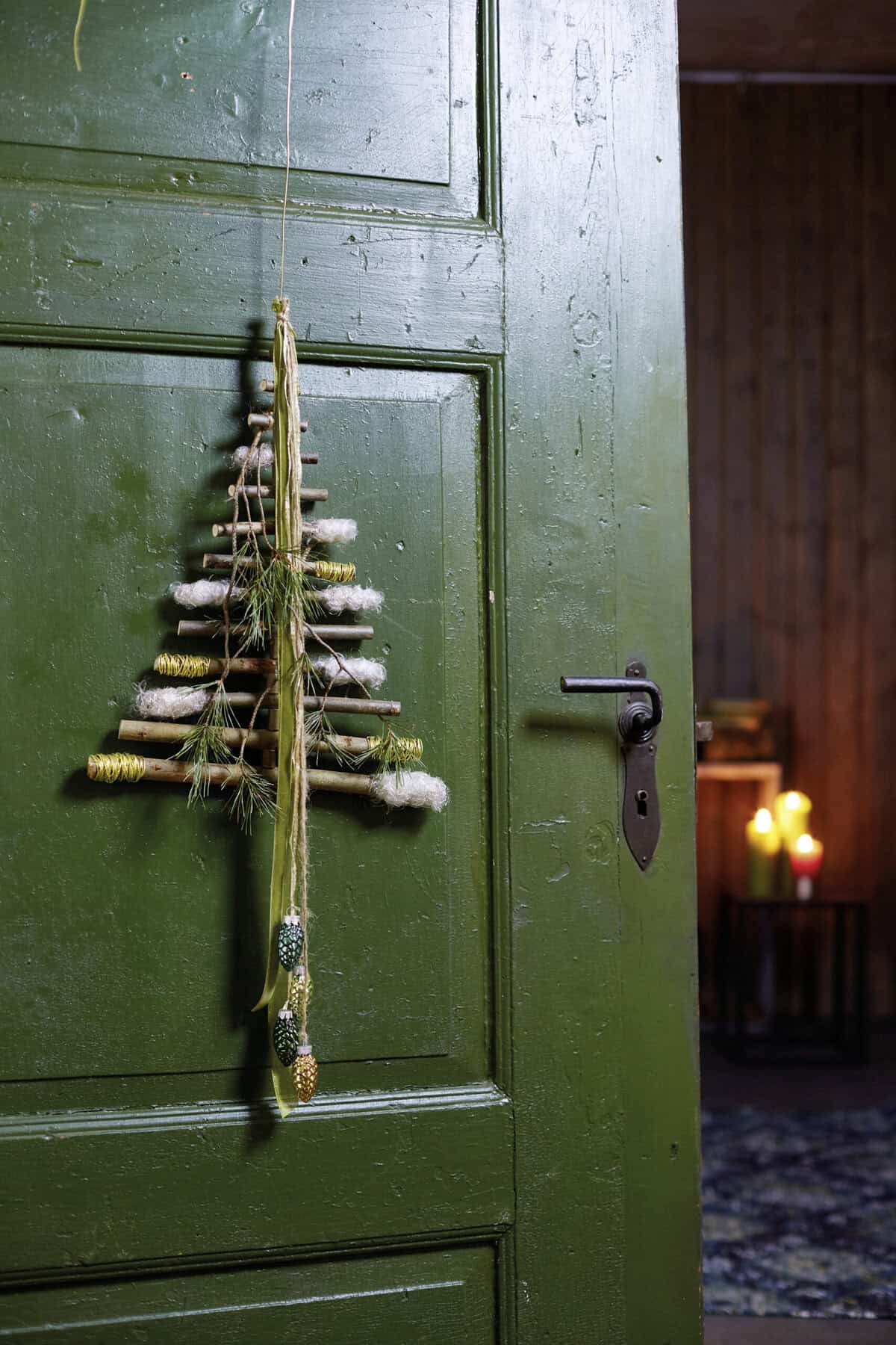 Schon an der Tür empfängt uns ein Weihnachtsbaum. Die zwölf Äste unterschiedlich zuschneiden und für die Aufhängung mittig durchbohren. Elf, etwa zwei Zentimeter lange Aststücke als Abstandshalter, der Länge nach durchbohren und abwechselnd mit den langen Ästen so auffädeln, dass sie nach oben hin kürzer werden. Hierzu Aluminiumdraht verwenden. Die Astenden beliebig mit Papierwickeldraht oder Engelshaar  betonen. Kiefernzweige und Glasschmuck an Bändern oder Schnur locker drüberhängen lassen.