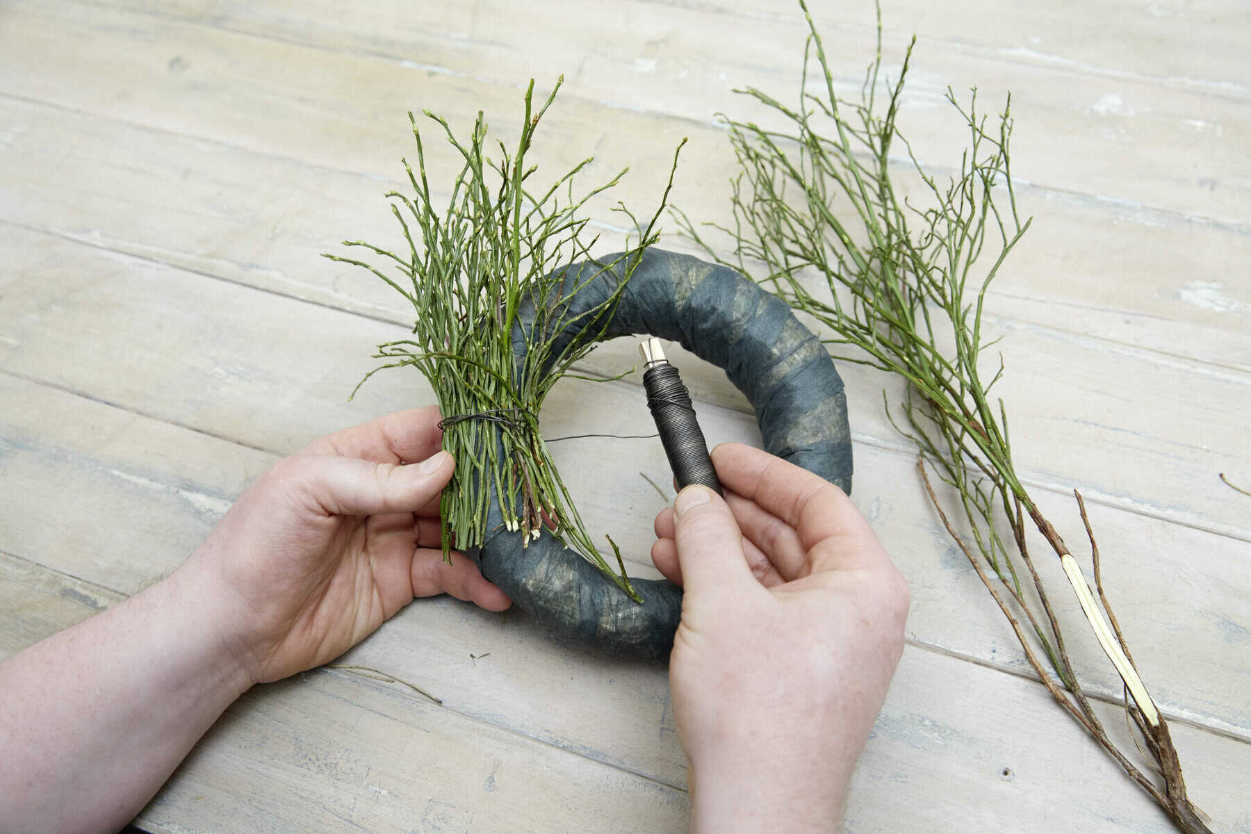 Zunächst den mit Kranzwickelband ummantelten Strohrömer locker und gleichmäßig mit Heidelbeerzweigen umwickeln und mit Wickeldraht fixieren. Dann die Narzisse in einen kleinen Tontopf setzen. Die Erde wird mit etwas Moos und Zwiebeln locker abgedeckt. Zum Schluss den Topf mittig in den vorbereiteten Kranz stellen – fertig ist ein rustikaler Frühlingsgruß, der drinnen wie draußen Freude macht.